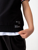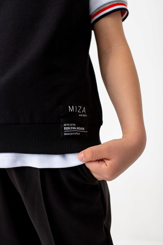 Отделка горловины, пройм и низа изделия выполнены из эластичного трикотажа в рубчик.
