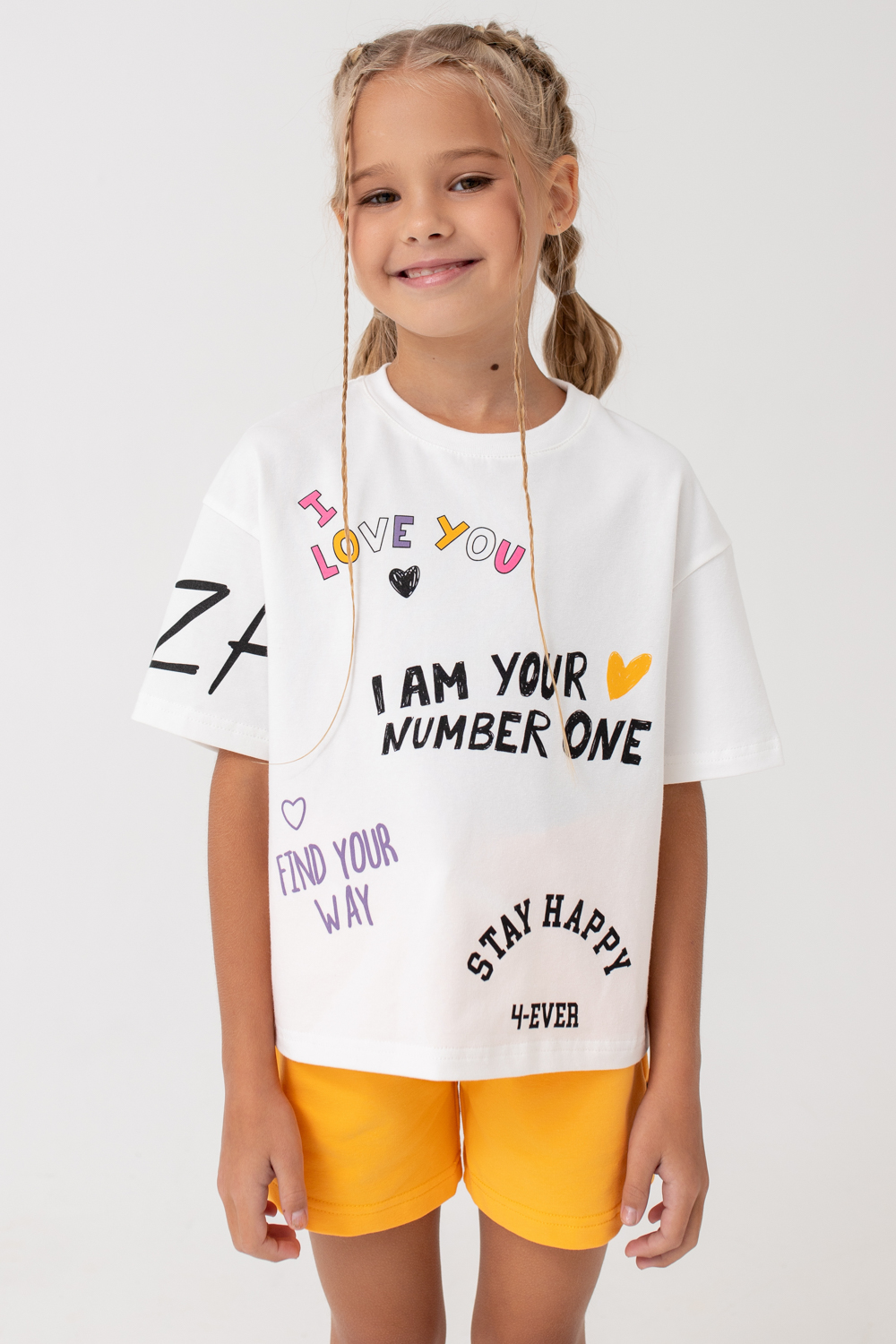 Костюм состоит из укороченной футболки прямого кроя и свободных шорт с карманами.