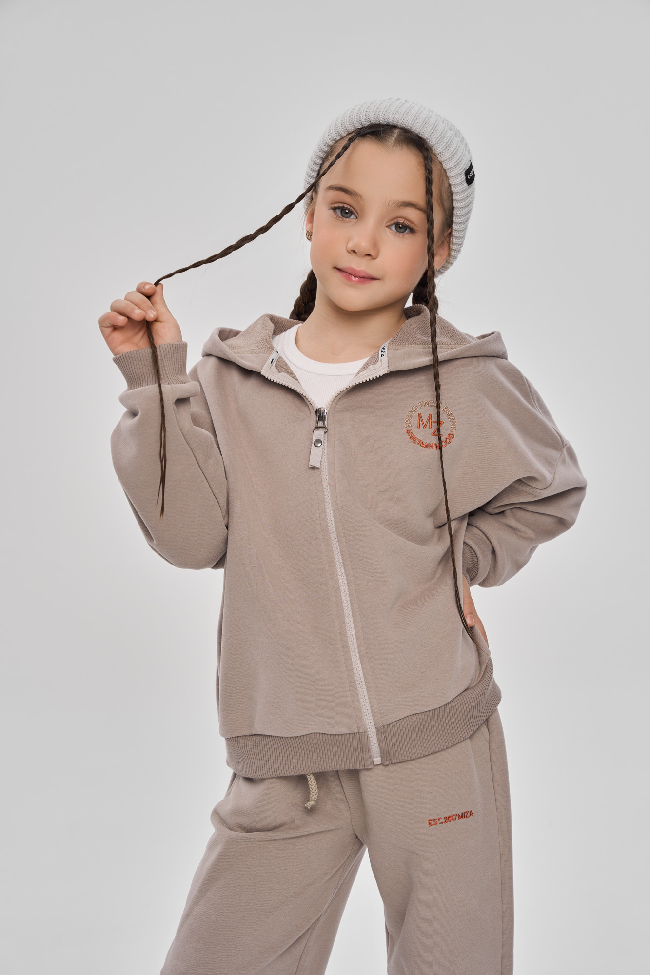 Состоит из худи на молнии и брюк джоггеров.