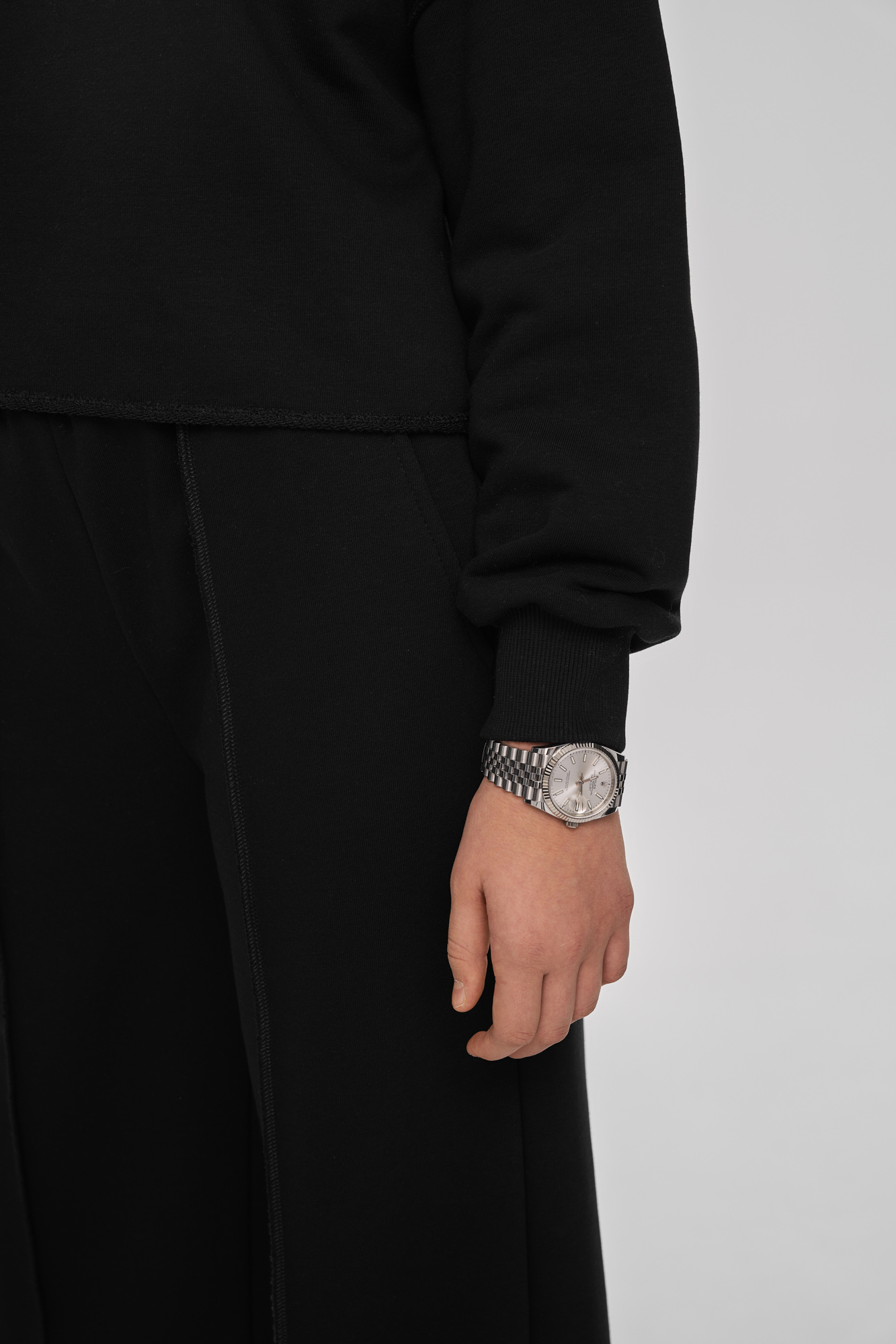 Костюм свободного кроя из премиального футера с петельной изнанкой.