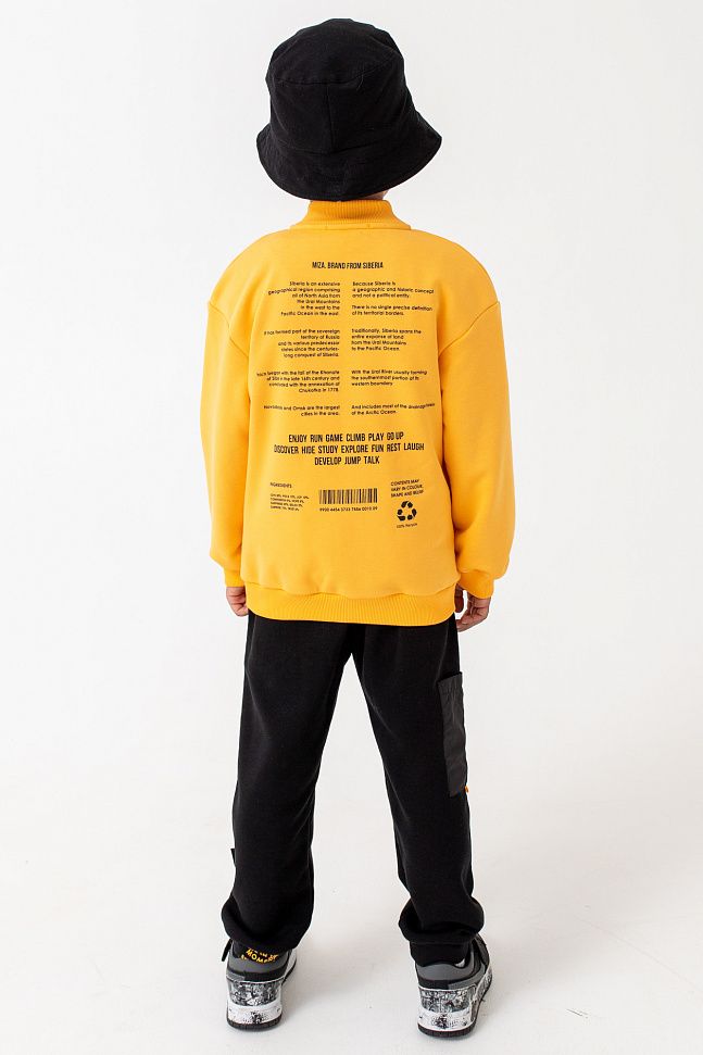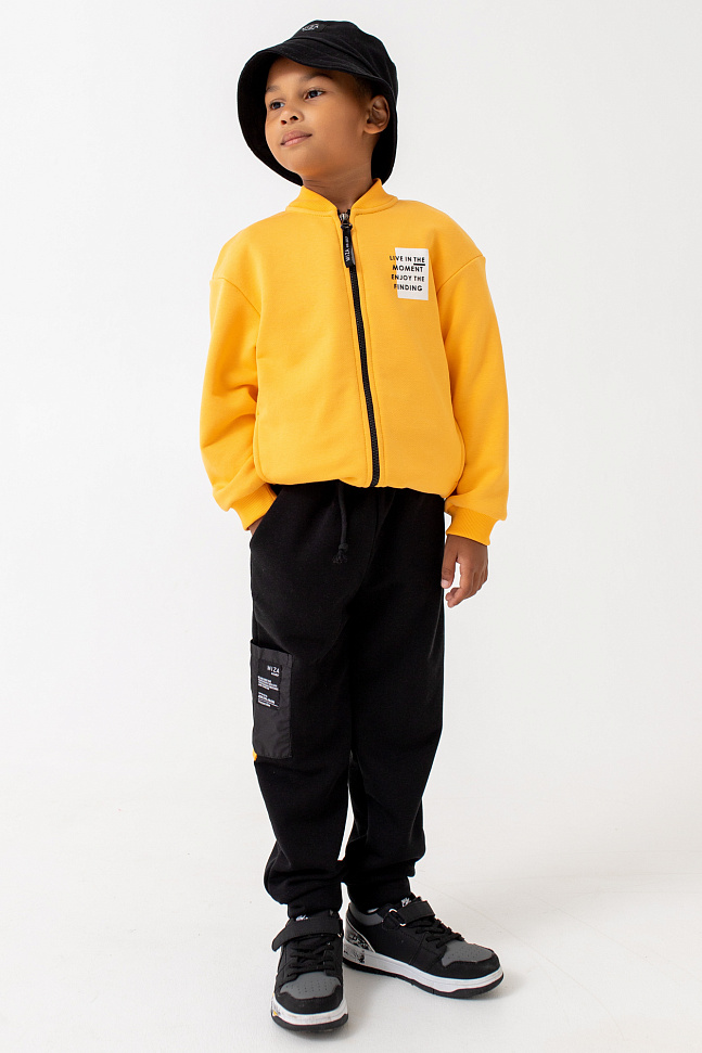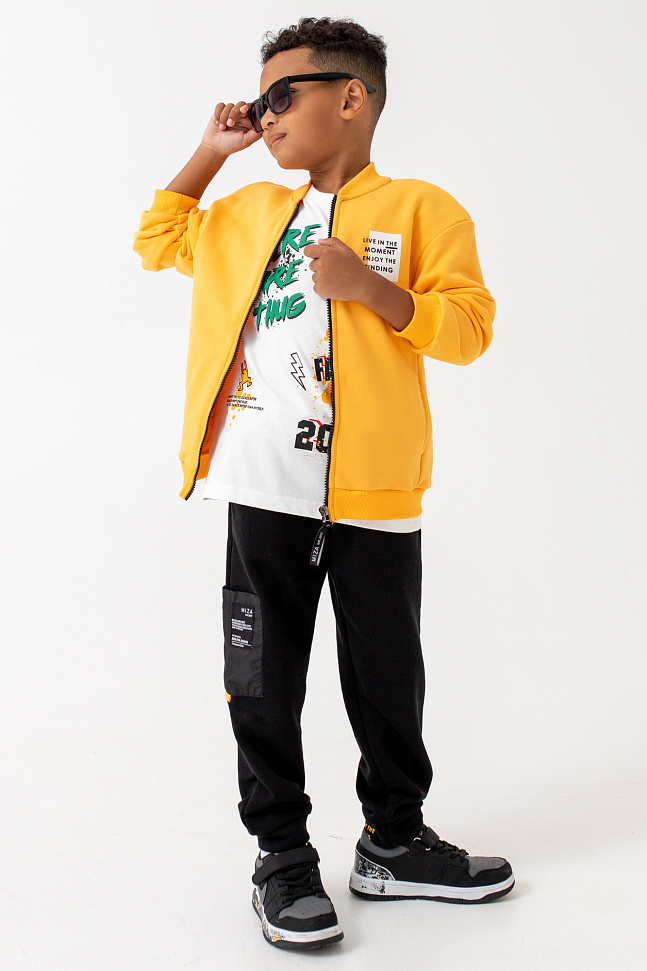 Костюм состоит из бомбера прямого кроя с застежкой на замке-молнии и брюк-джоггеров с накладным карманом.