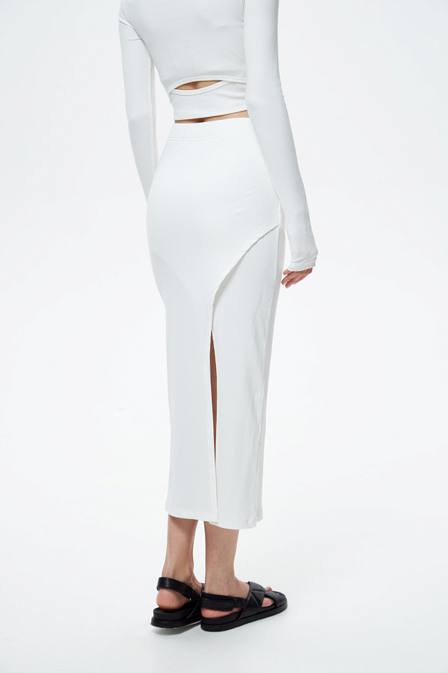 Состоит и укороченного лонгслива с разрезом на спинке и юбки.