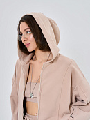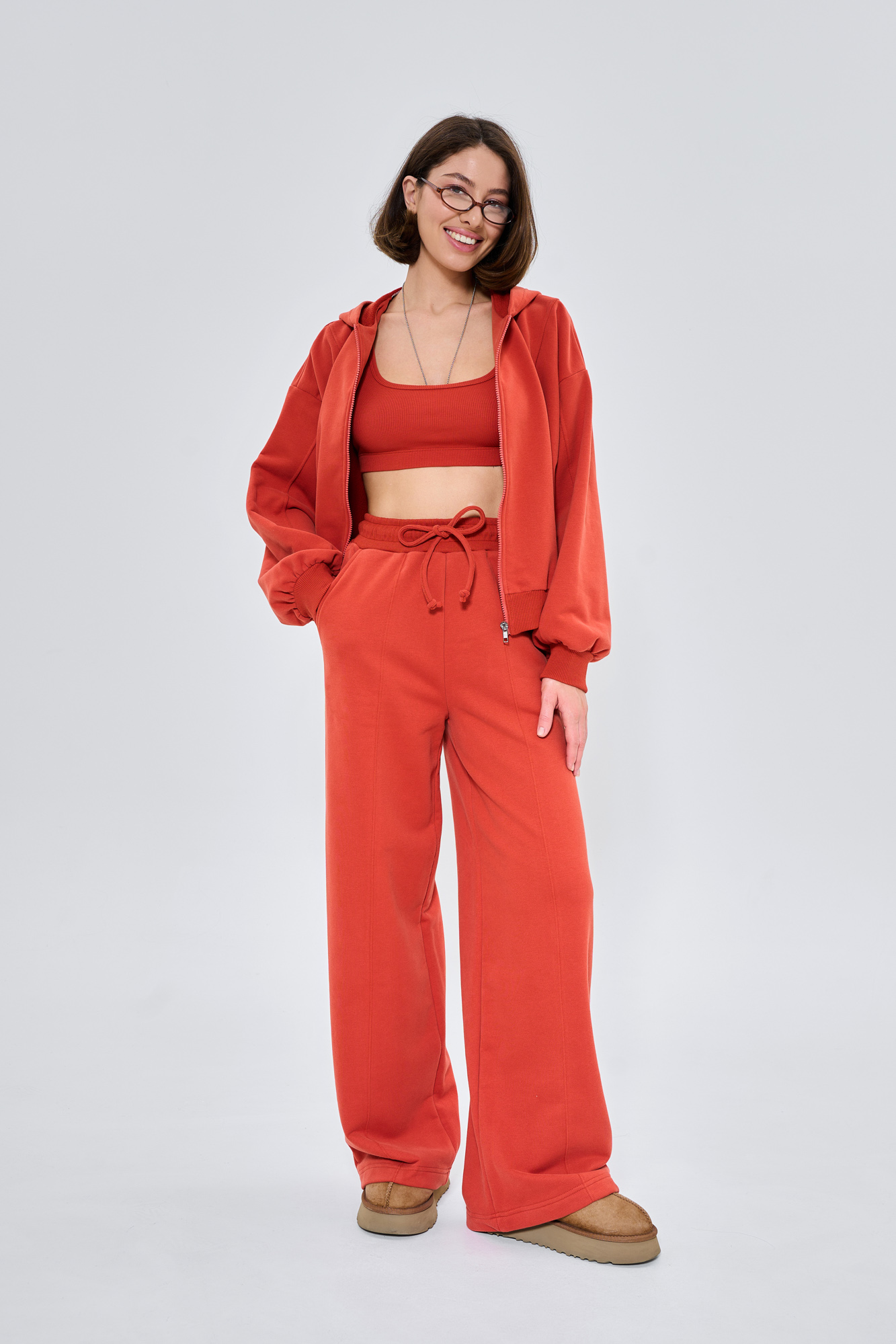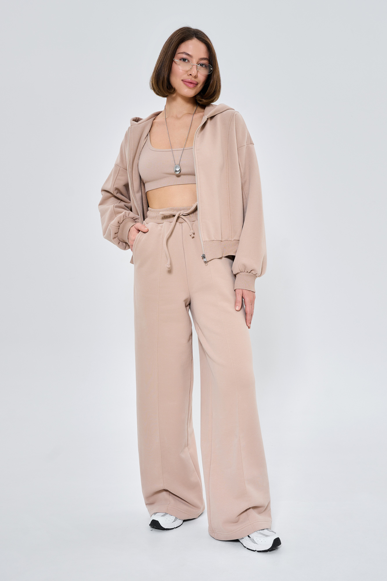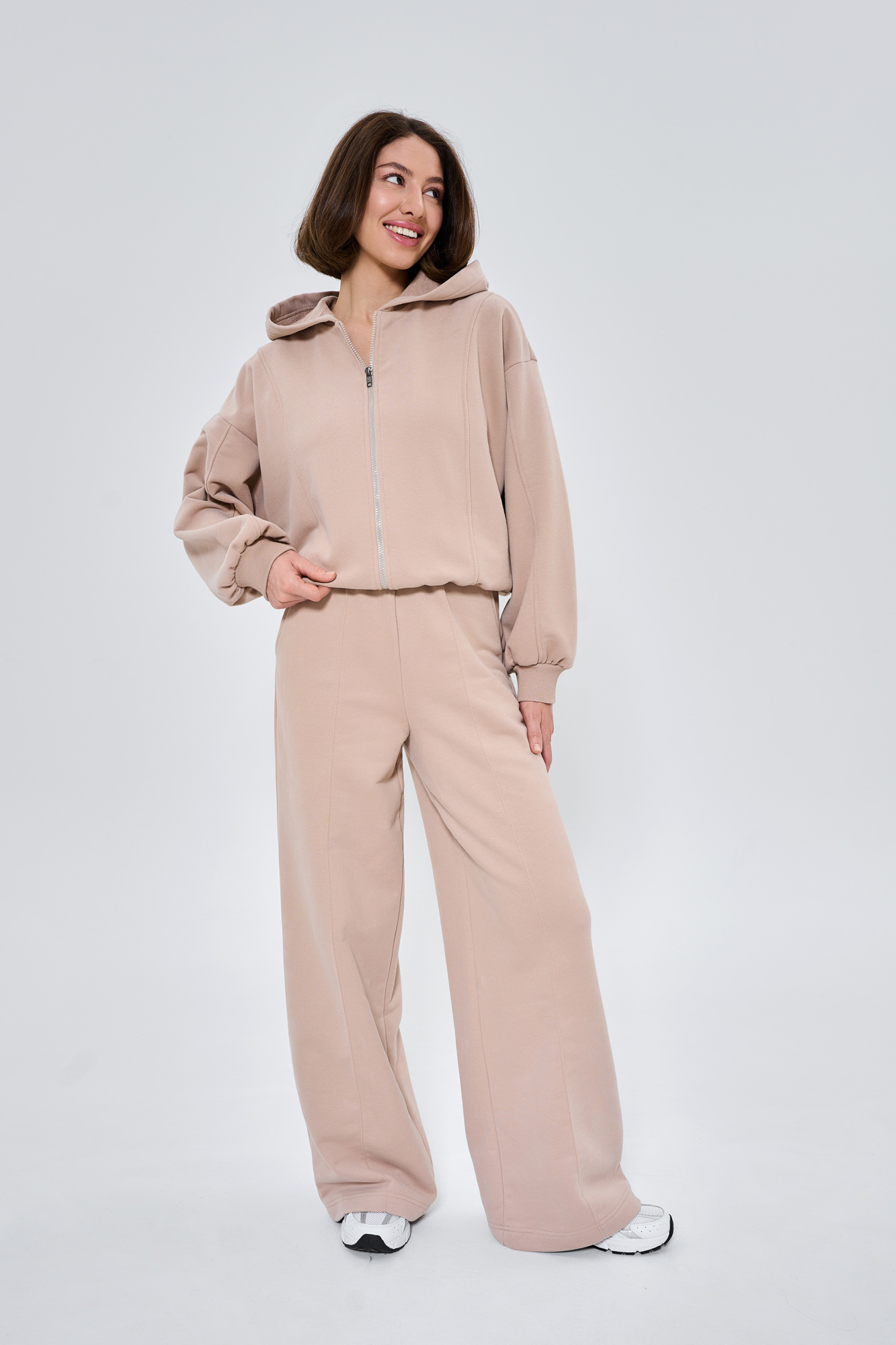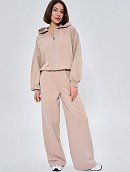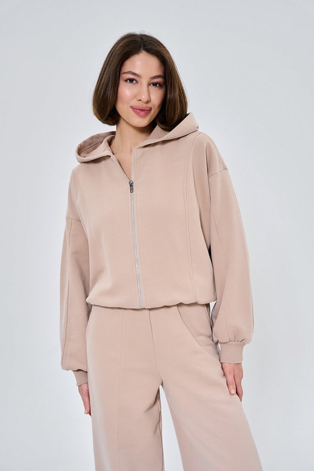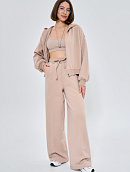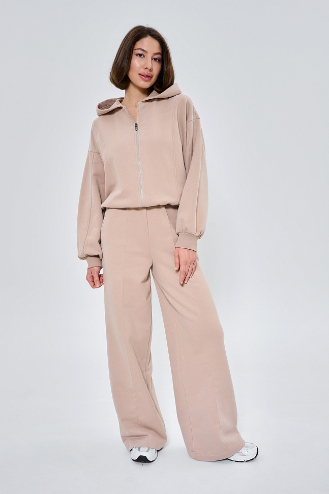 Состоит из худи объемного кроя на молнии с отделочными швами и прямых брюк палаццо с отделочным швом.