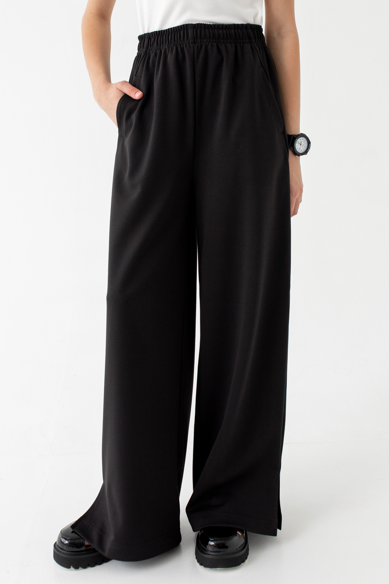 Брюки-палаццо, прямые, свободного кроя с разрезами внизу.