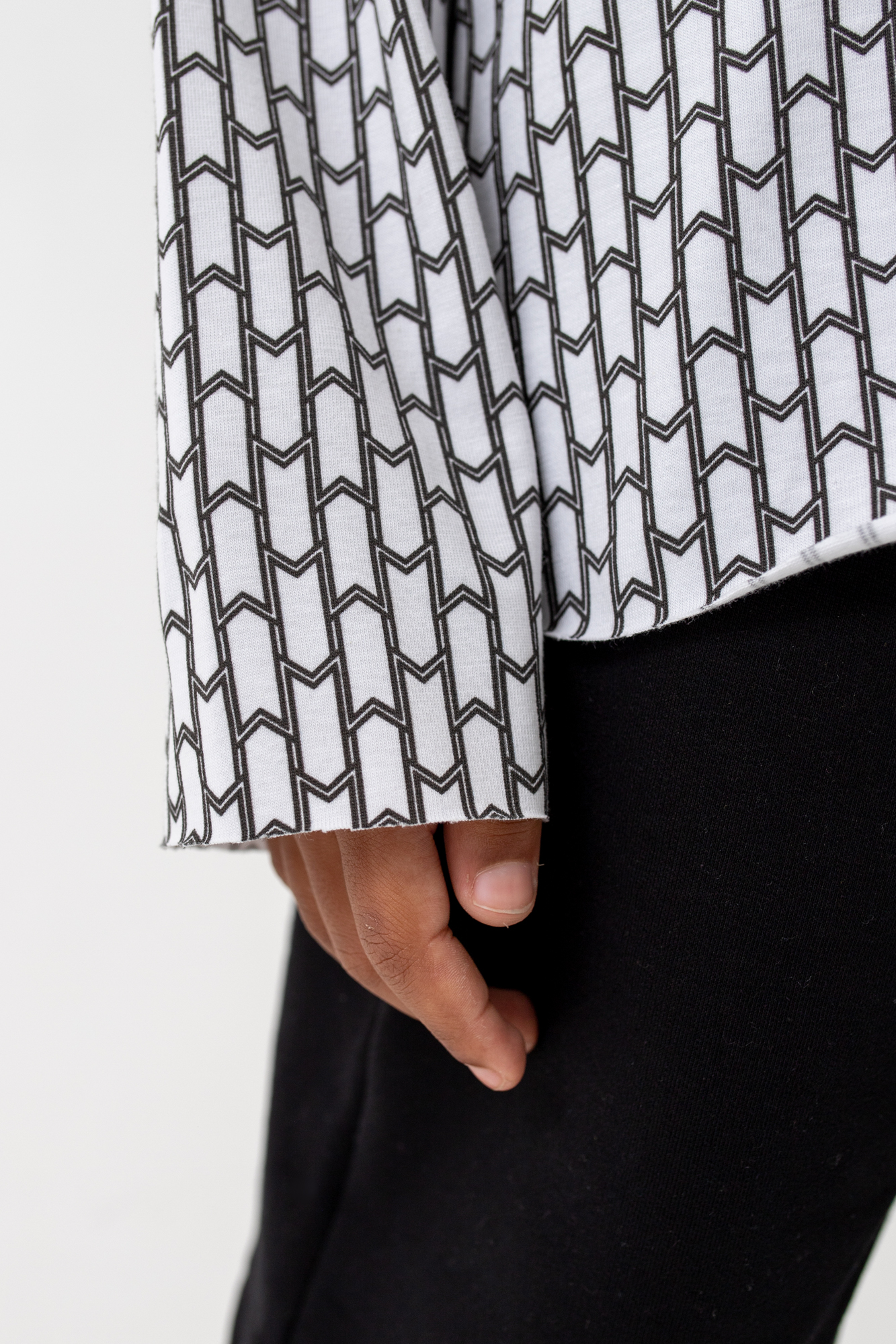 Горловина и низ изделия и рукавов выполнены с имитацией открытого среза.