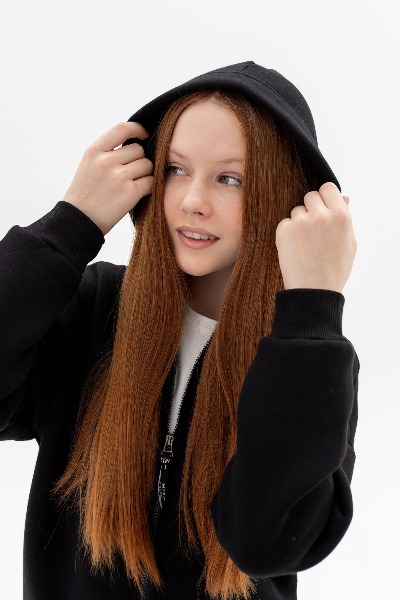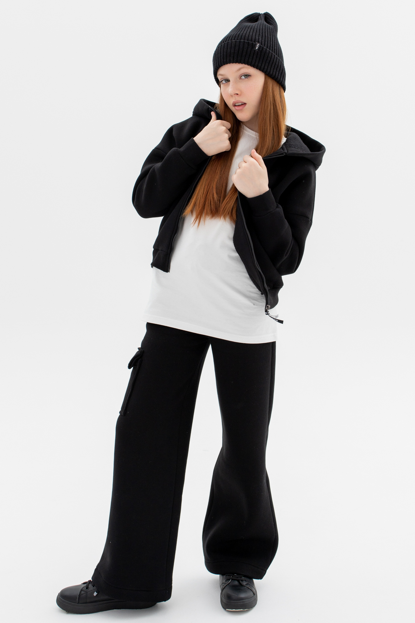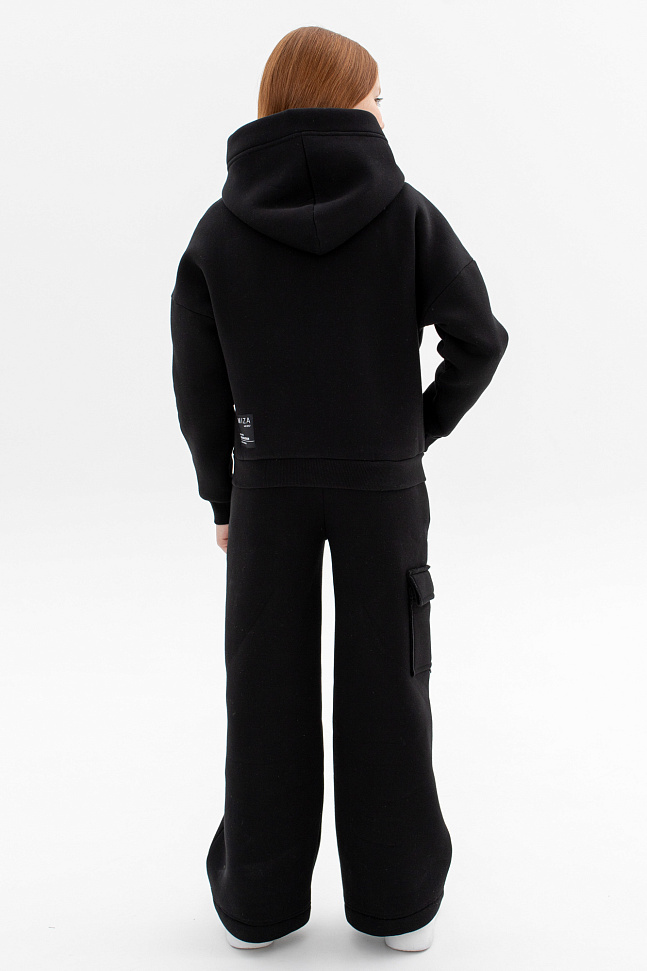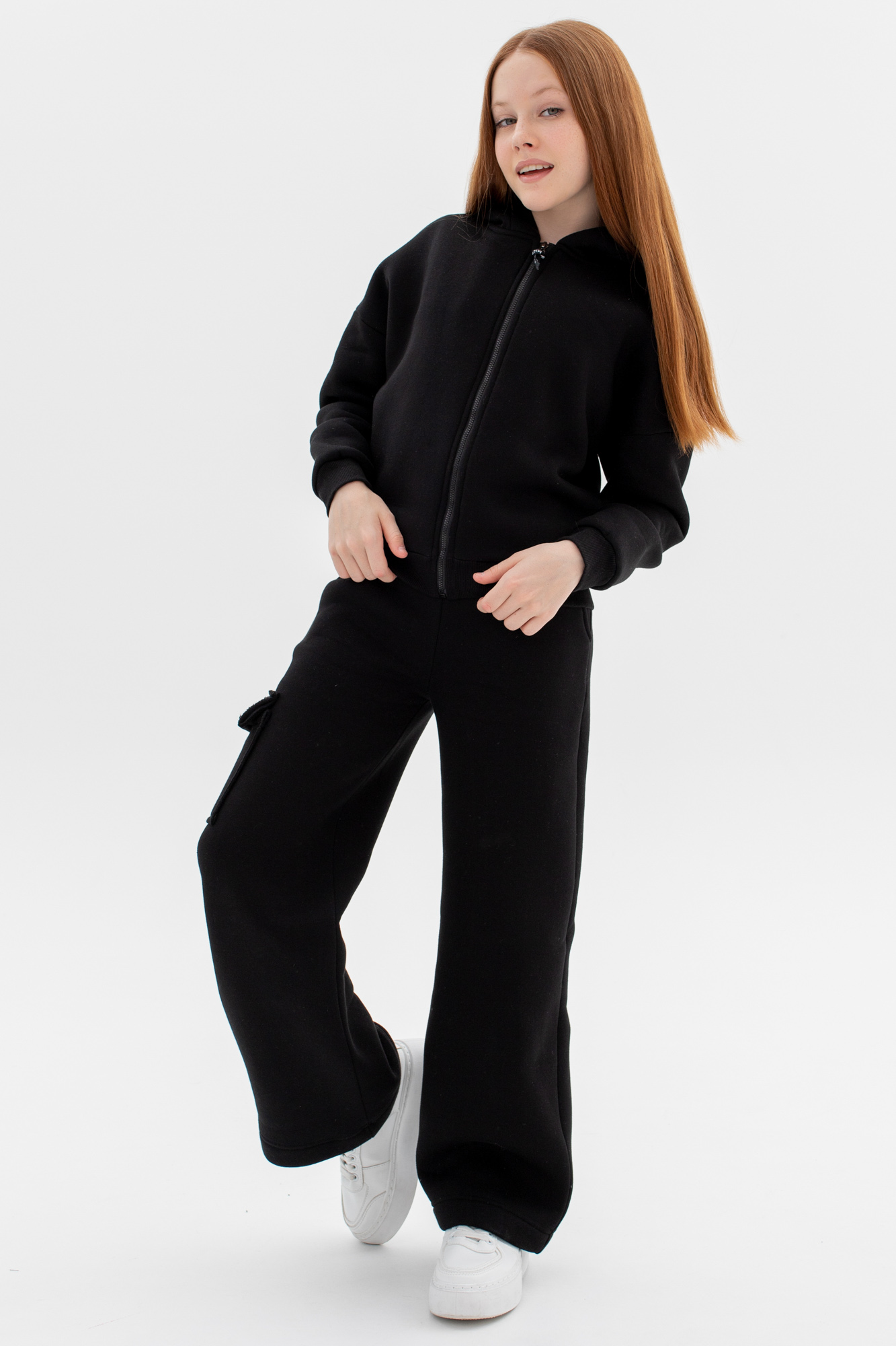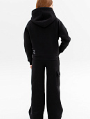 Состоит из укороченного худи на замке и широких брюк с накладным карманом на одной стороне.