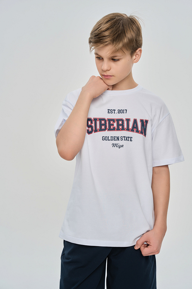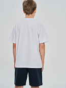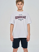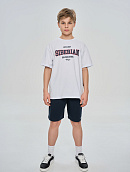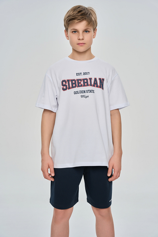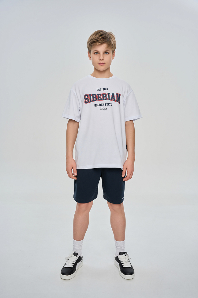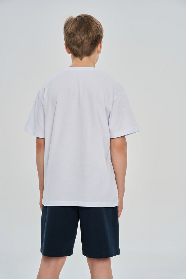 Костюм состоит из футболки свободного кроя и прямых свободных шорт с карманами.