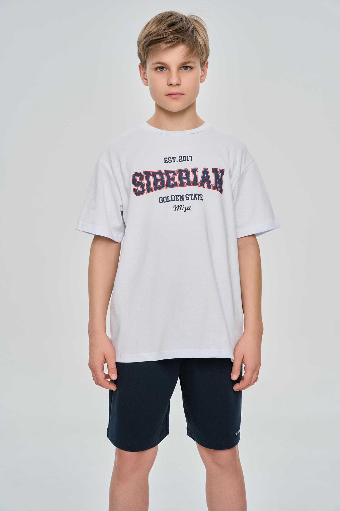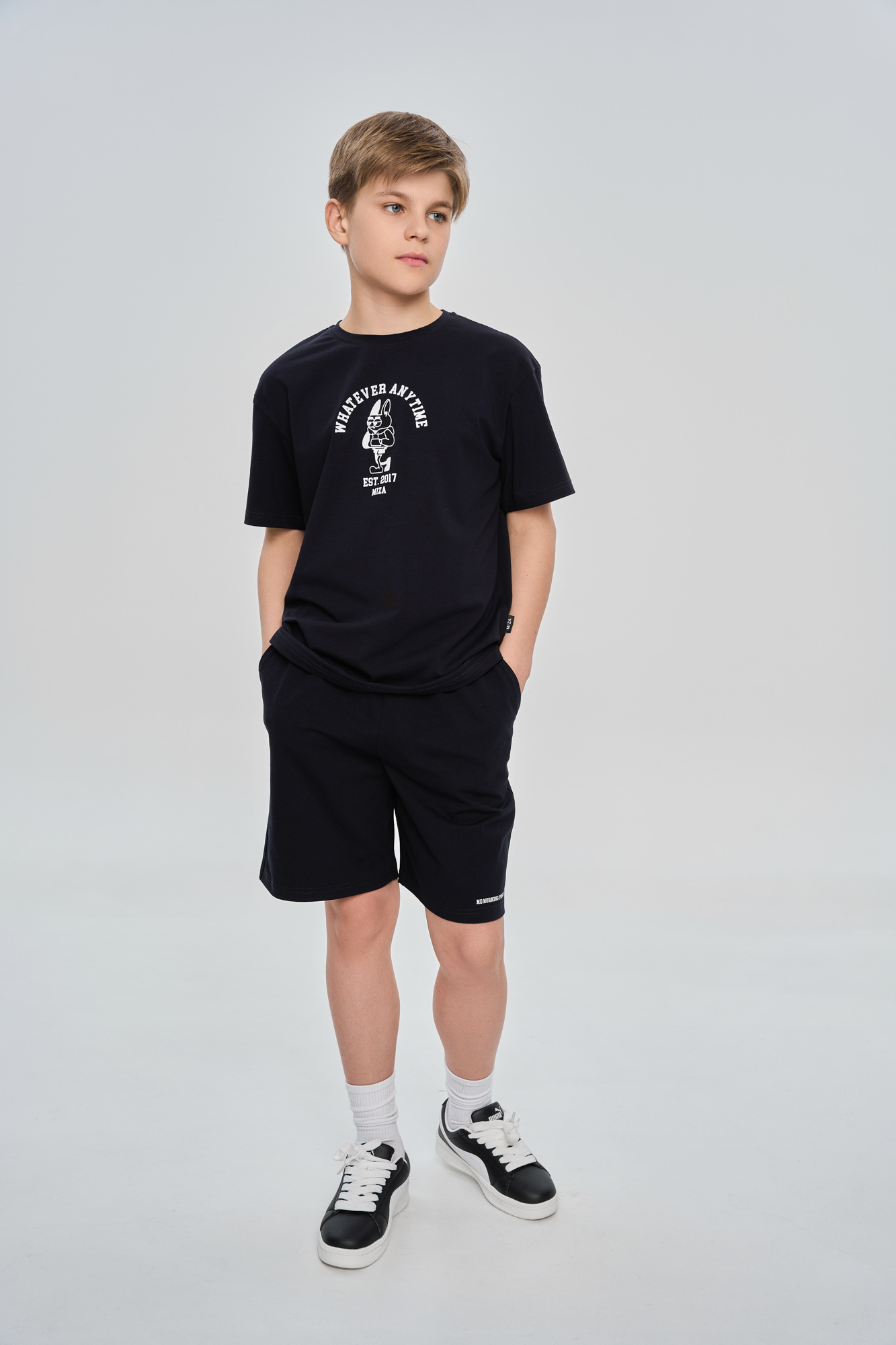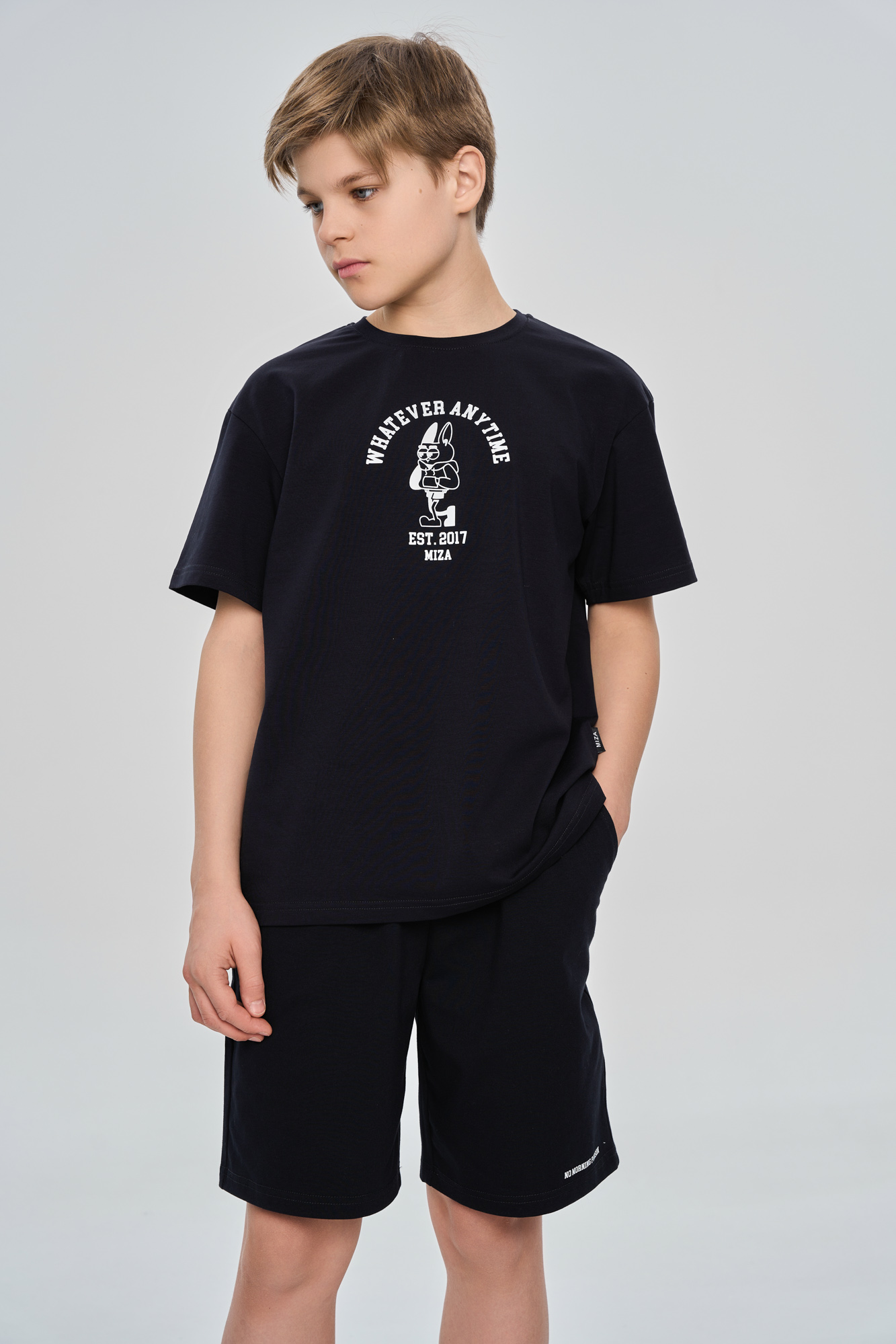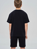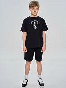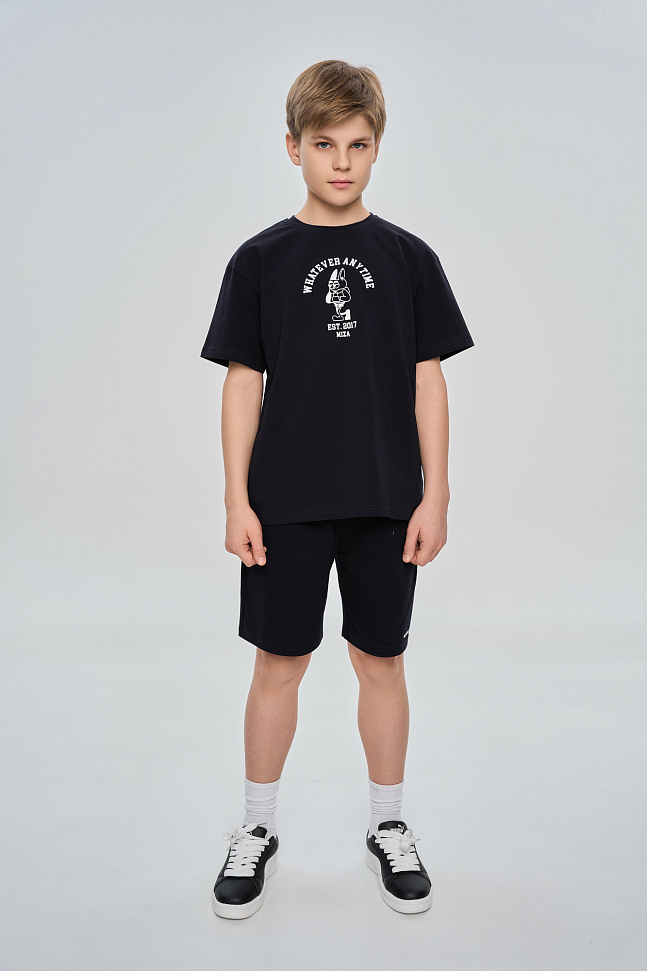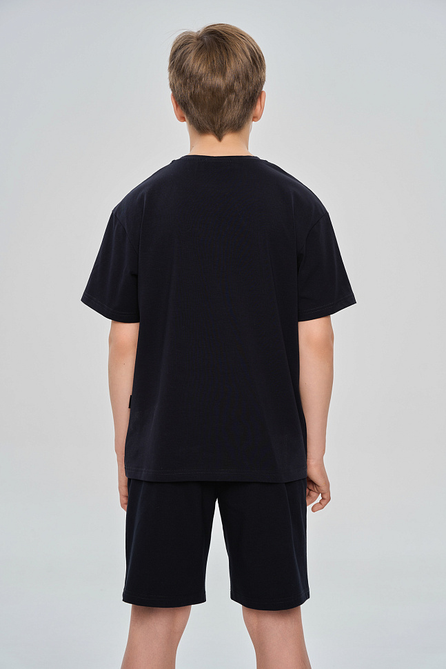 Костюм состоит из футболки свободного кроя и прямых свободных шорт с карманами.