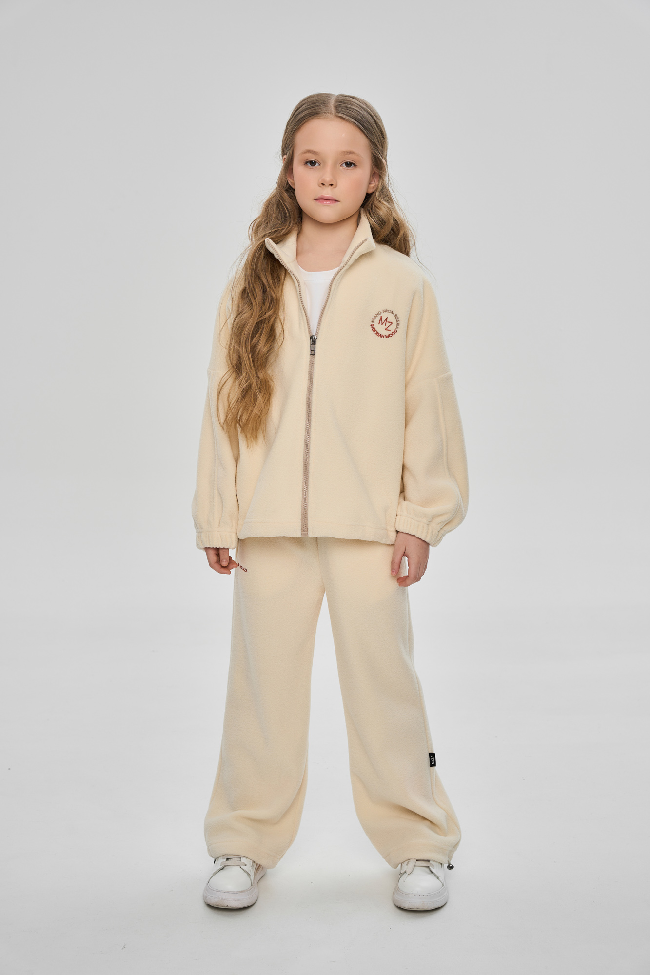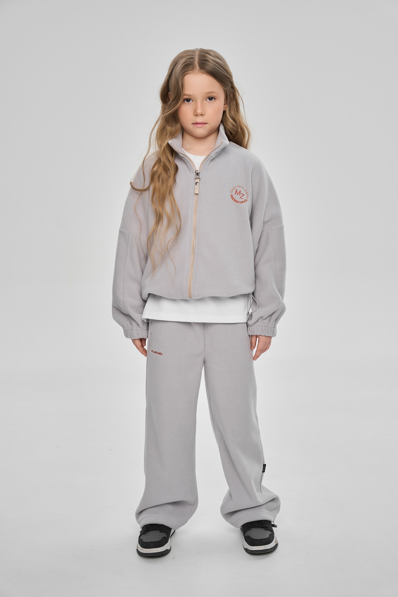 Состоит из свитшота с воротником-стойкой на молнии и брюк-джоггеров.