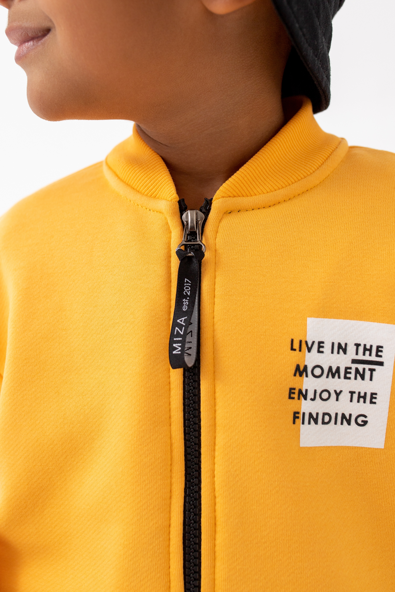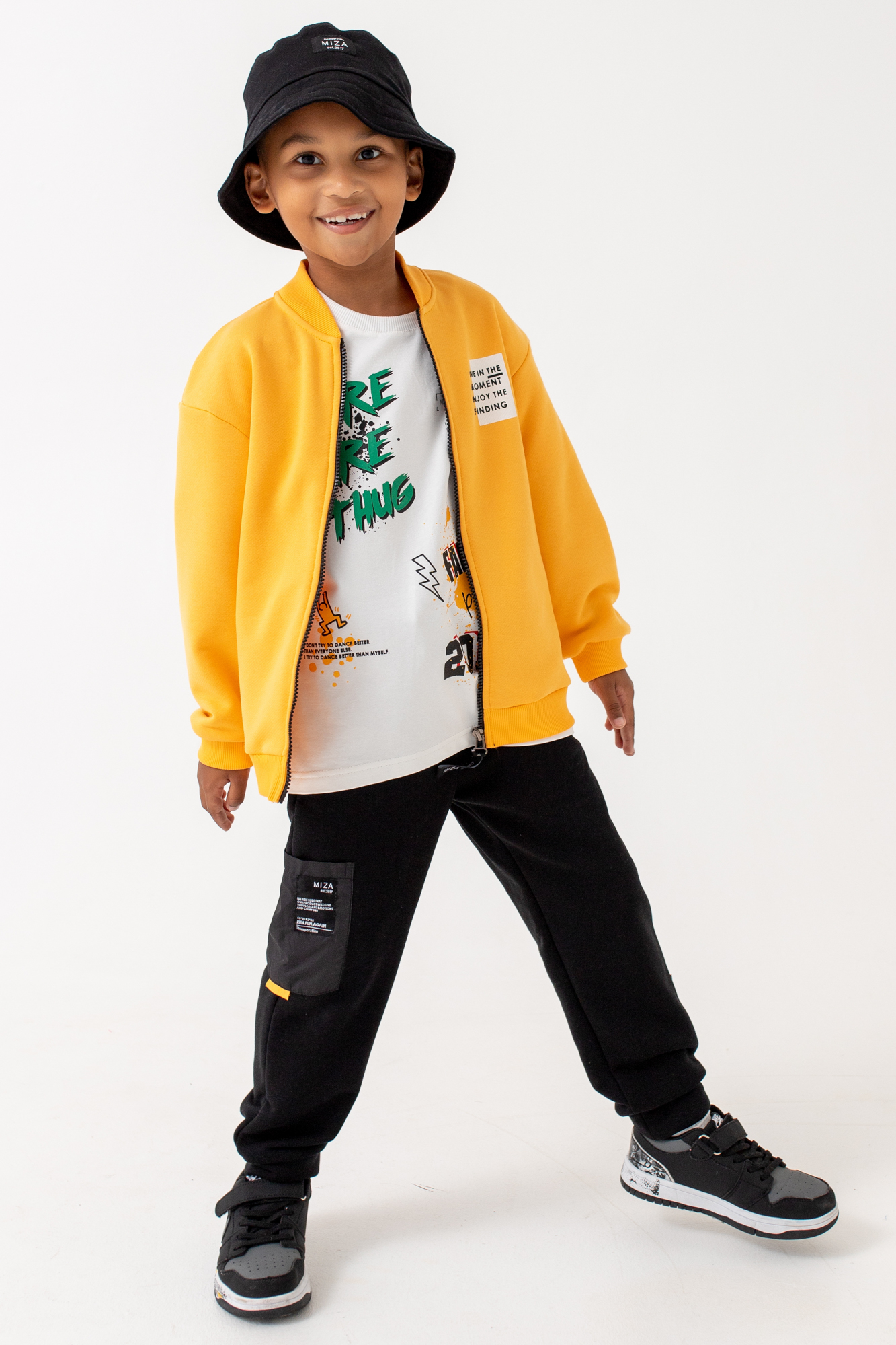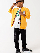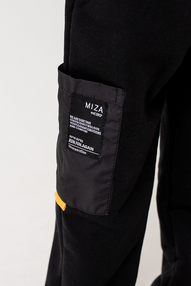 Костюм состоит из бомбера прямого кроя с застежкой на замке-молнии и брюк-джоггеров с накладным карманом.