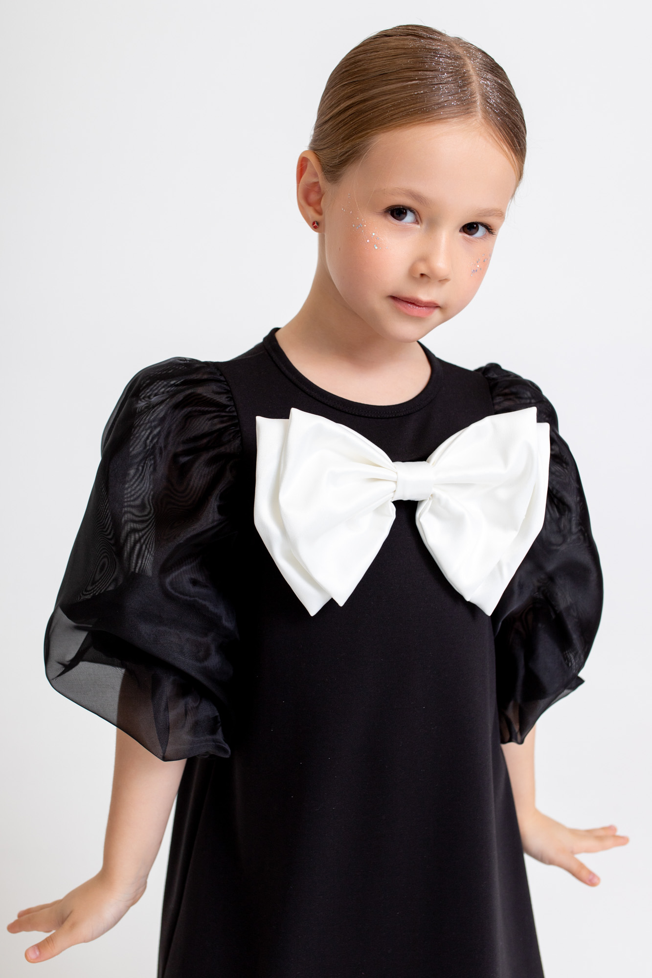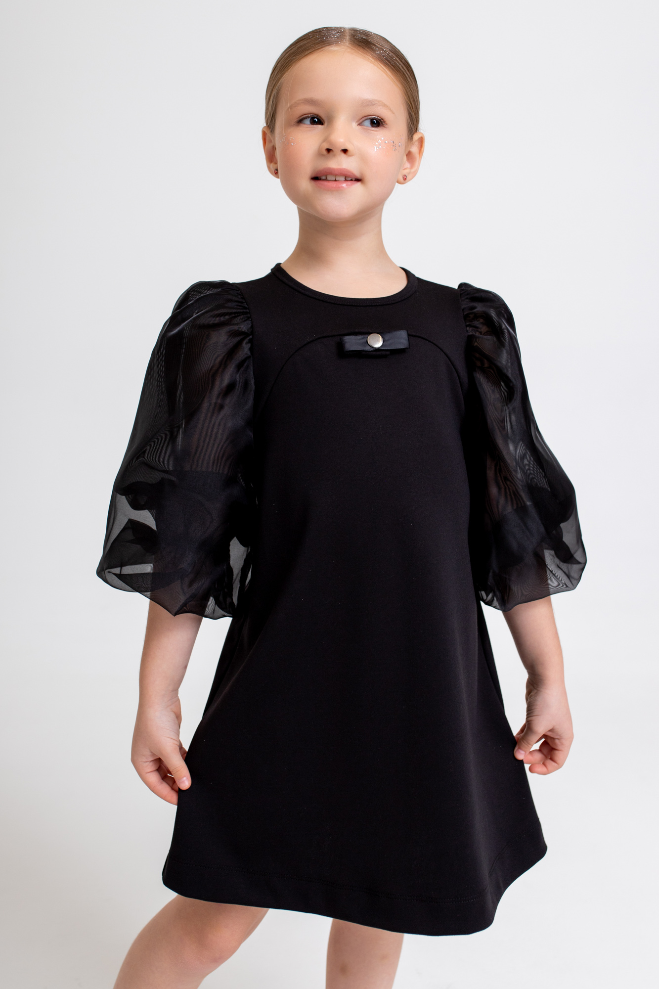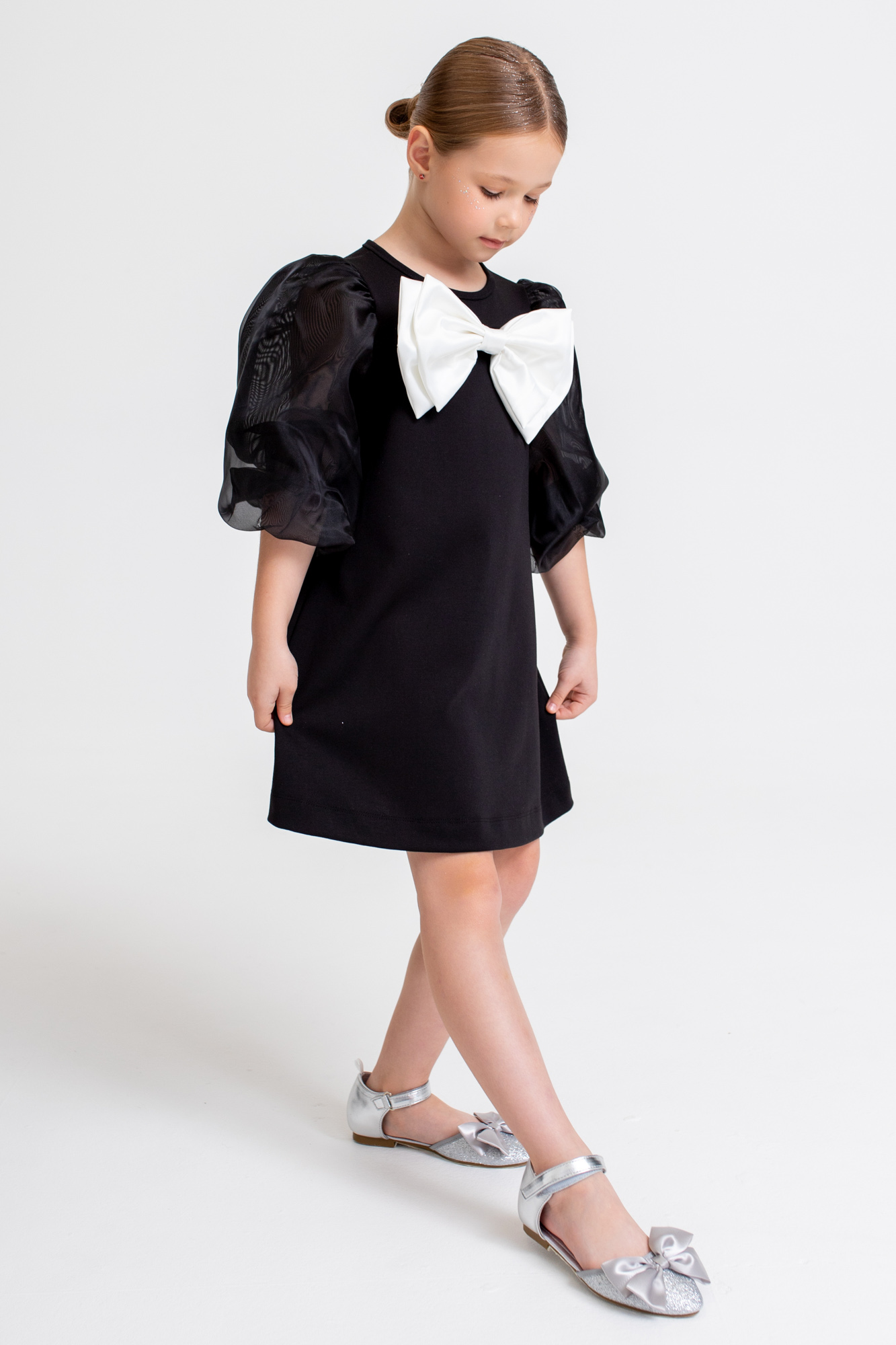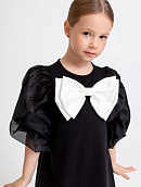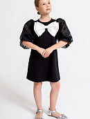 Спереди декоративный съемный бант, который можно заменить на маленький бант в тон платья (в комплекте).