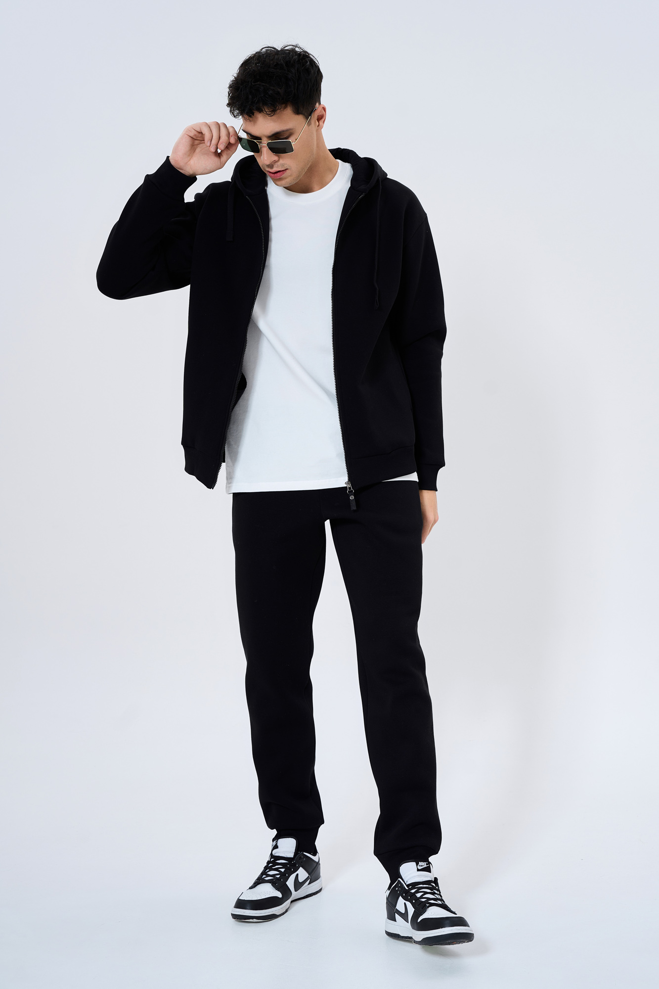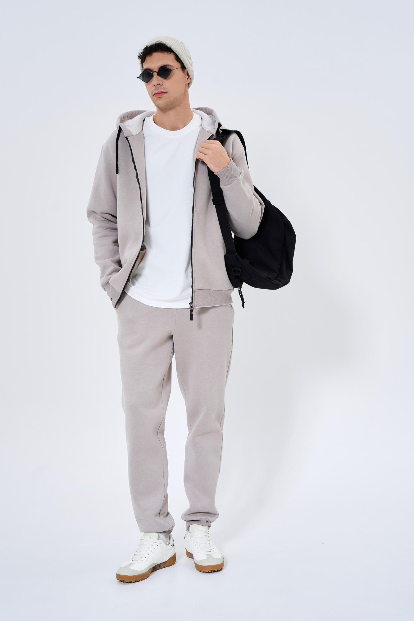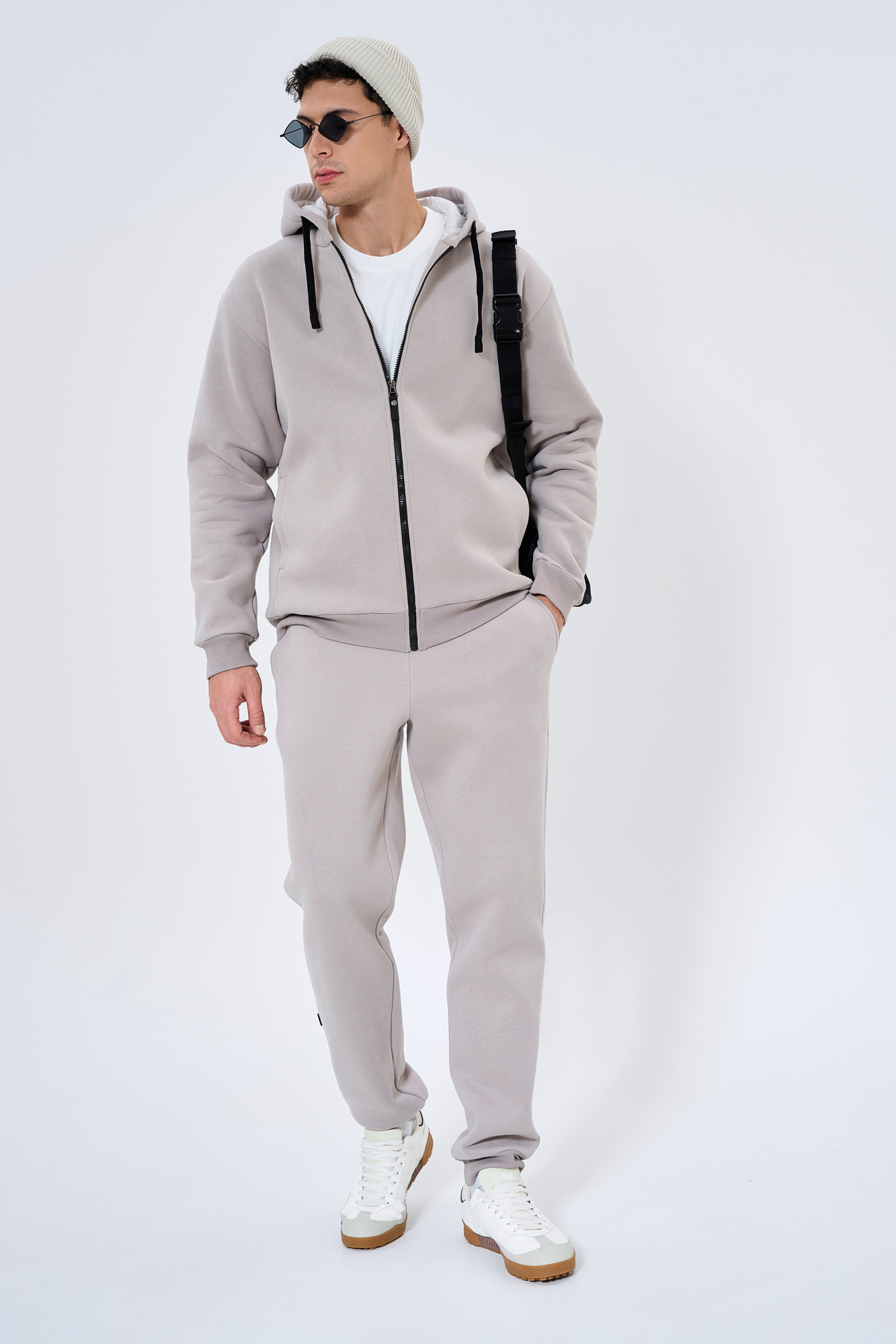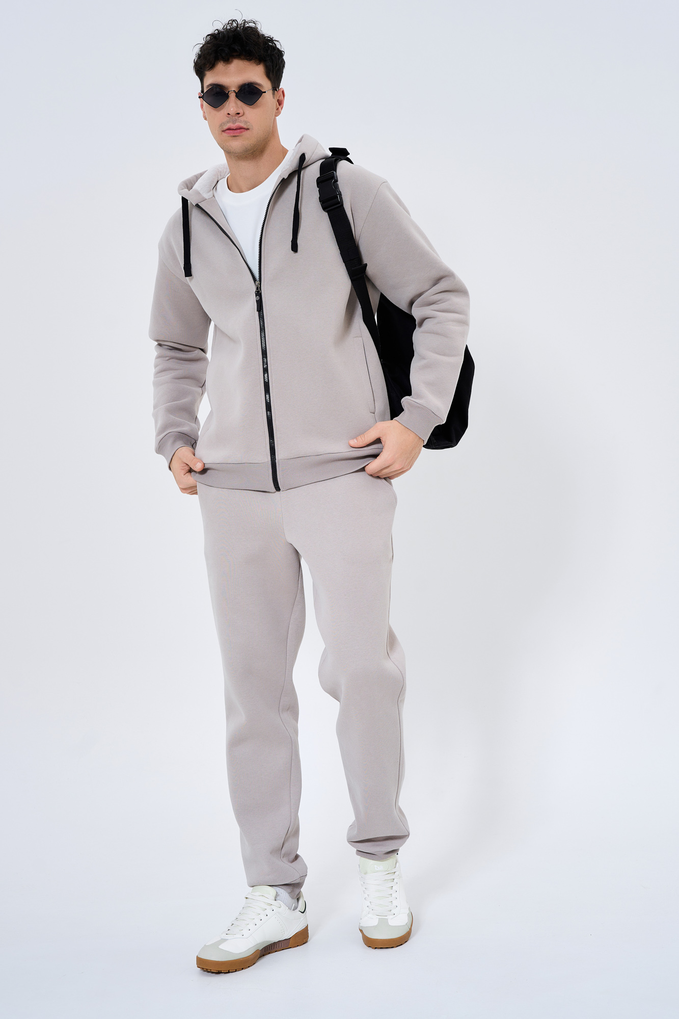 Состоит из худи на замке и брюк-джогеров.