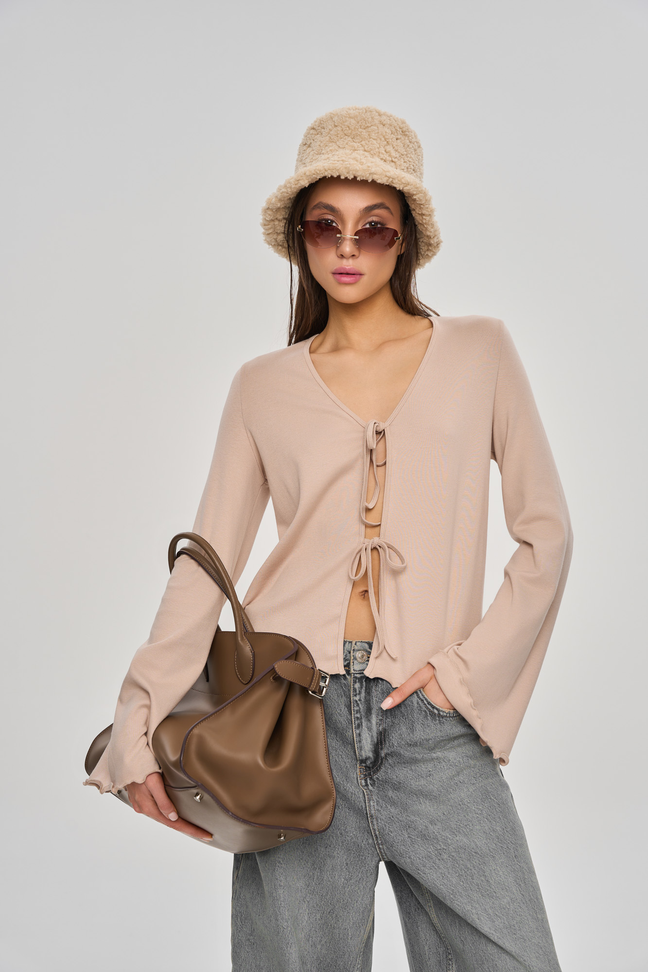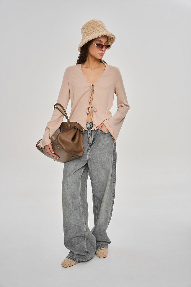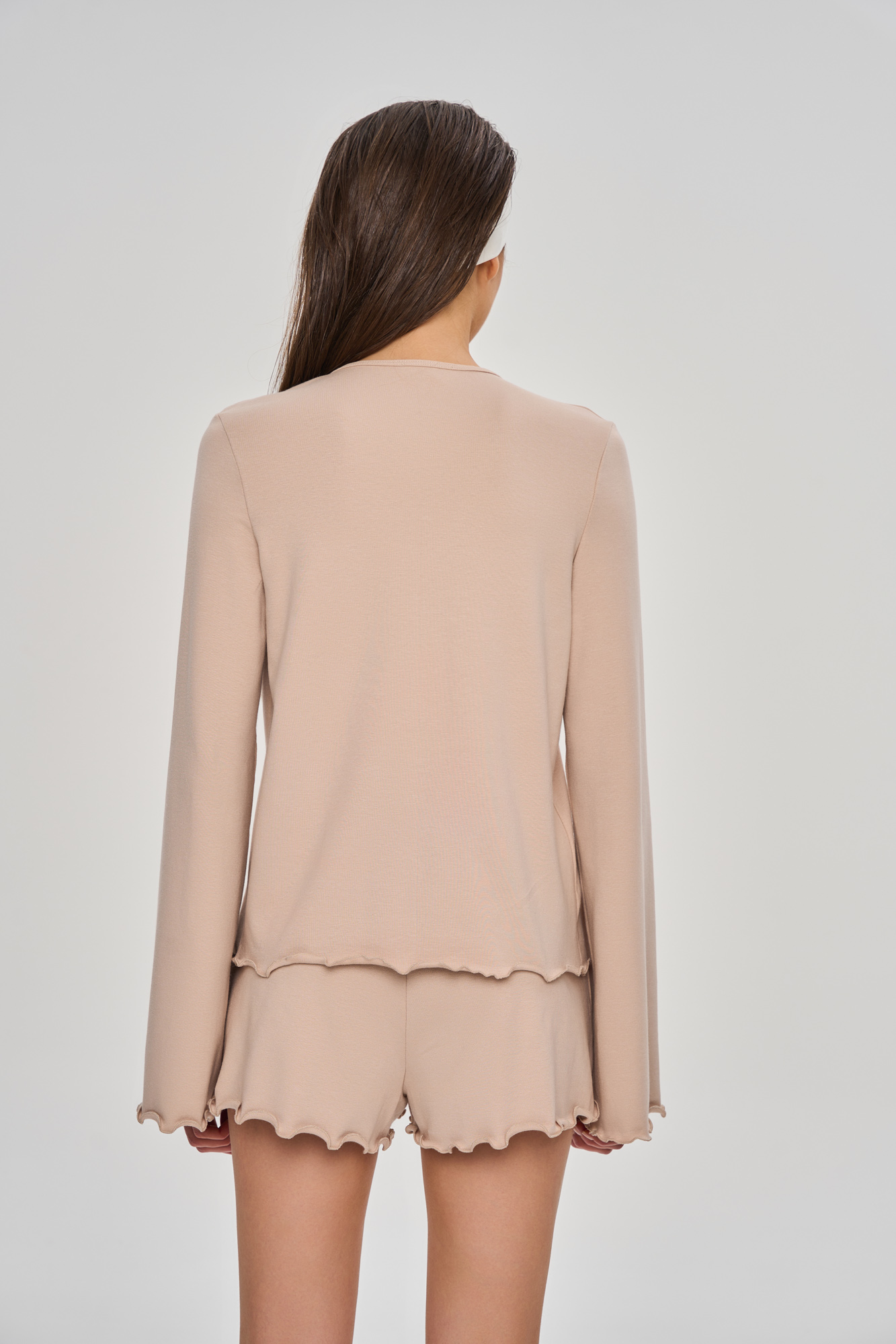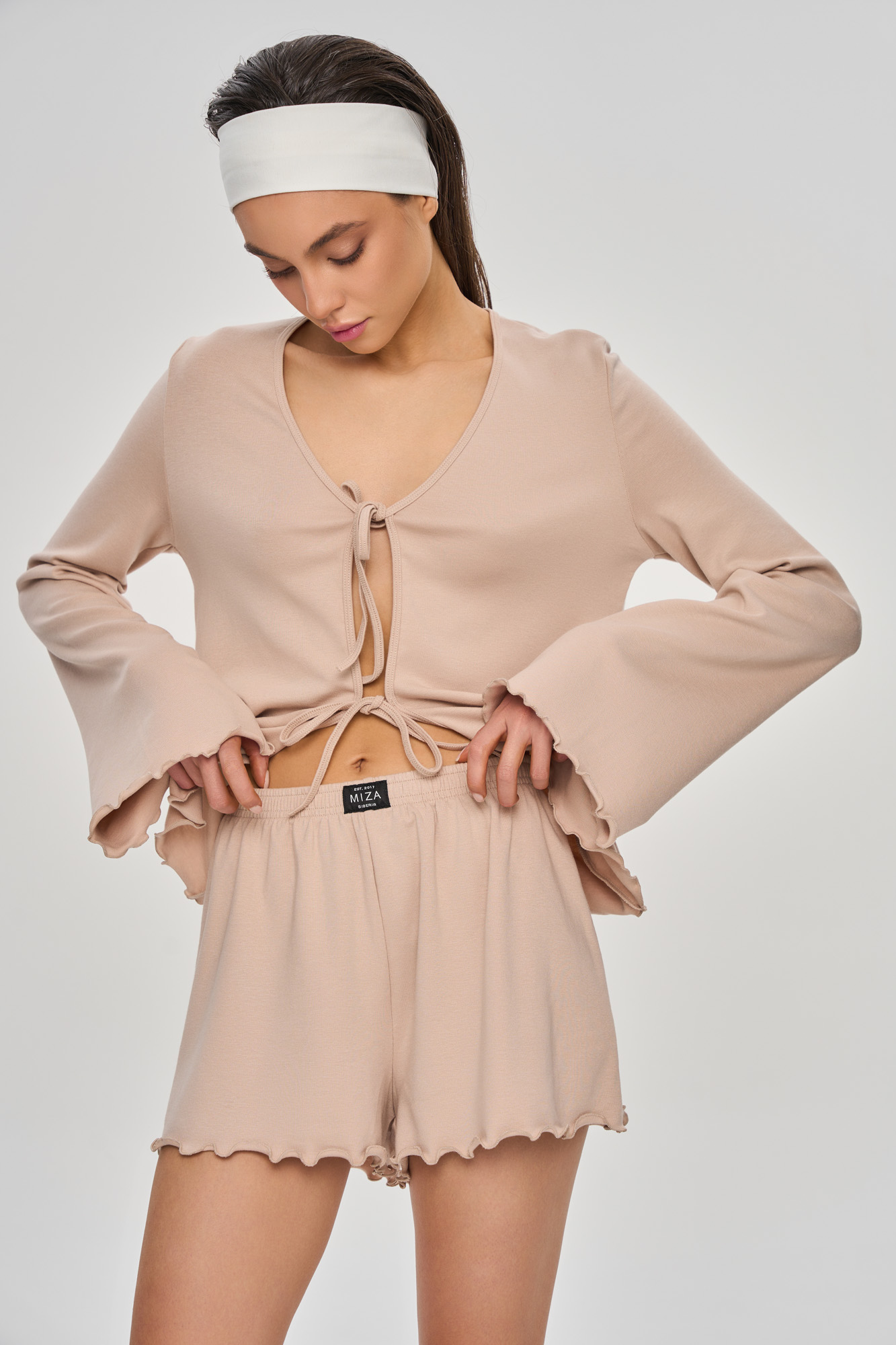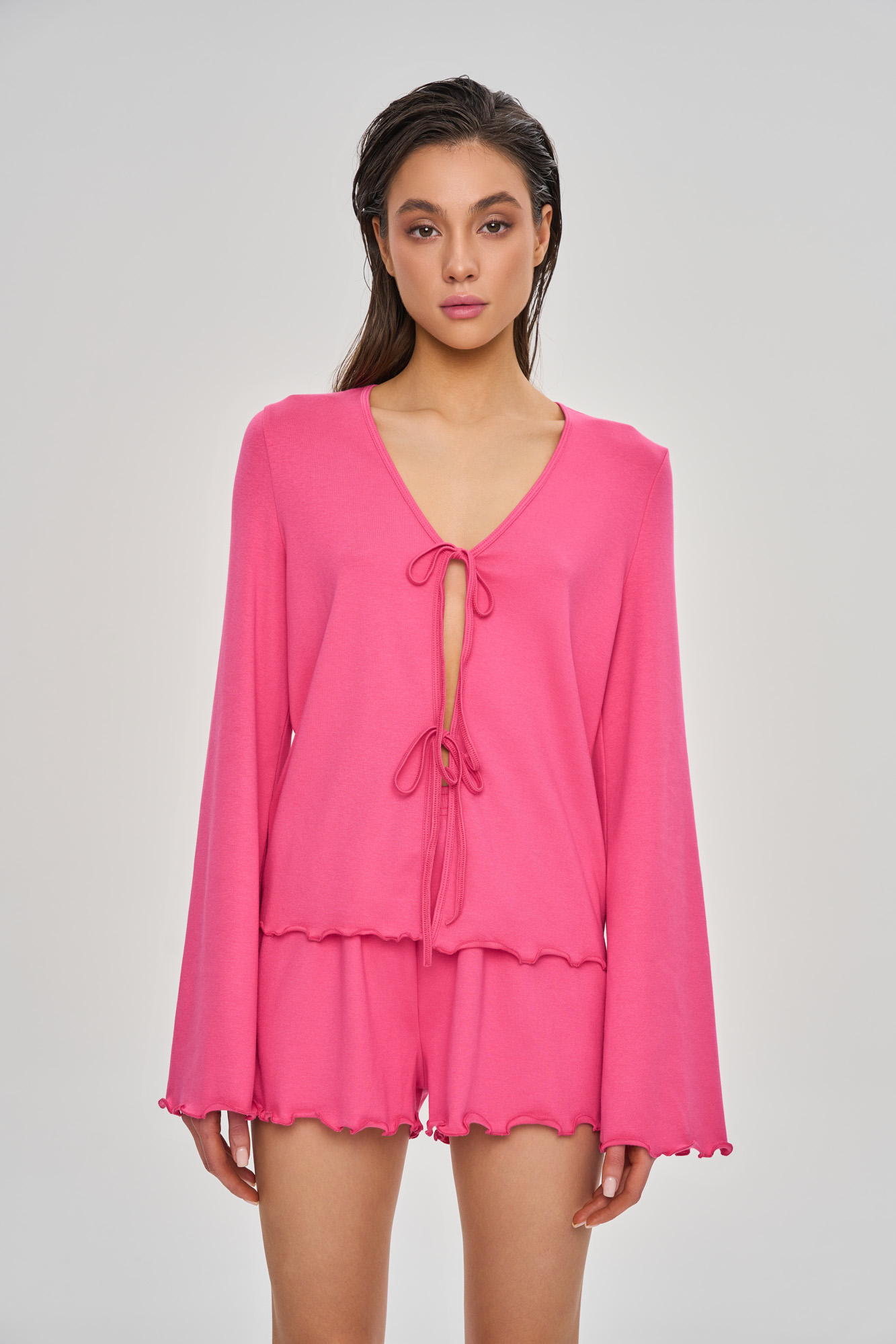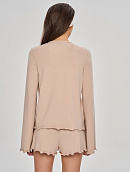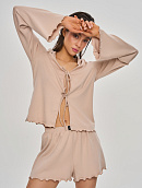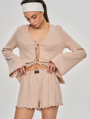 Комплект состоит из лонгслива свободного кроя на декоративной завязке и свободных шортиков.