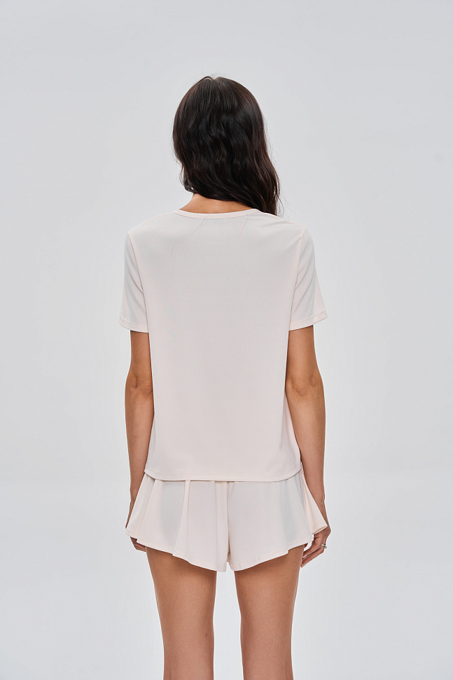 Состоит из футболки свободного кроя с планкой на пуговицах и шортиков.