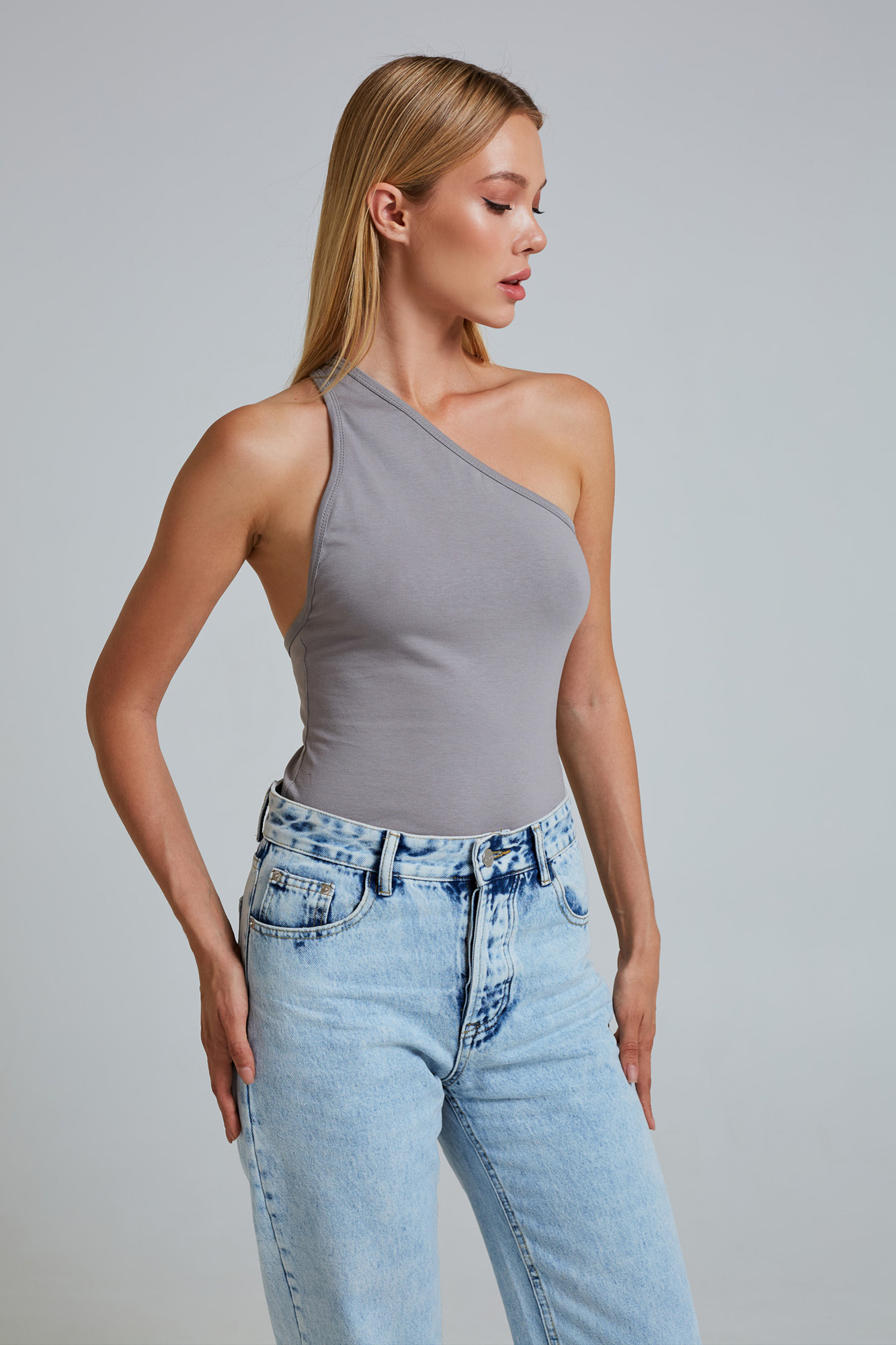 Стильная майка с ассиметричным плечом и открытой спиной для повседневных образов.