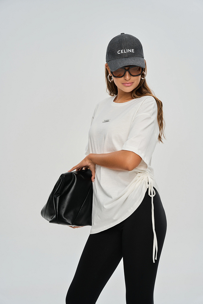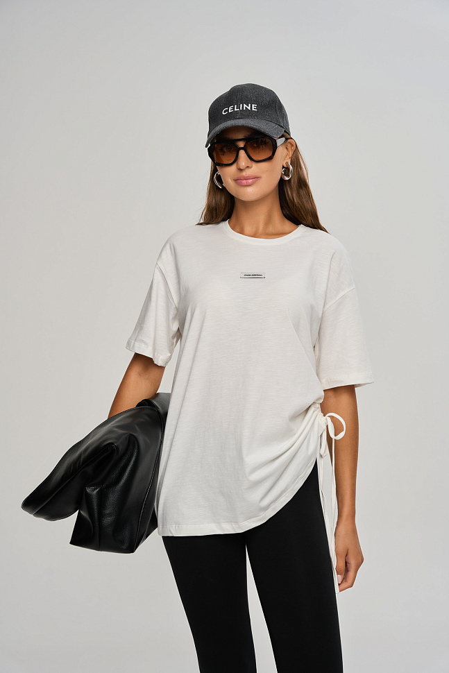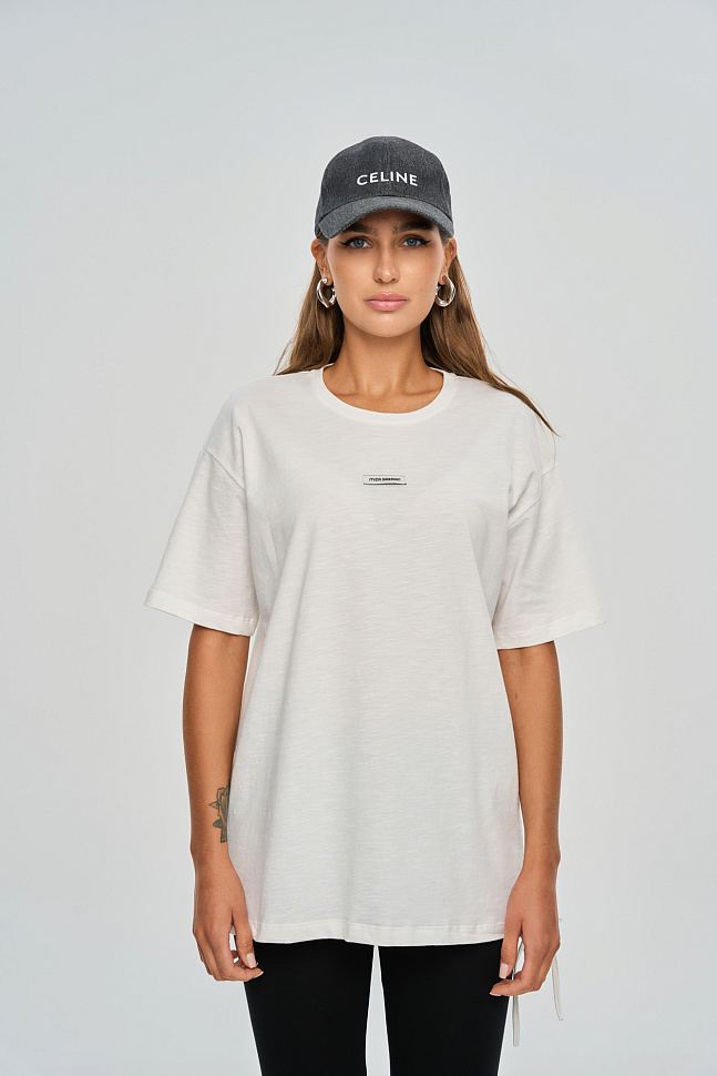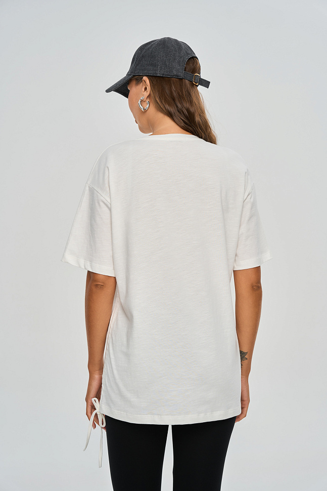 Футболка прямого кроя свободного силуэта, немного удлиненная.
