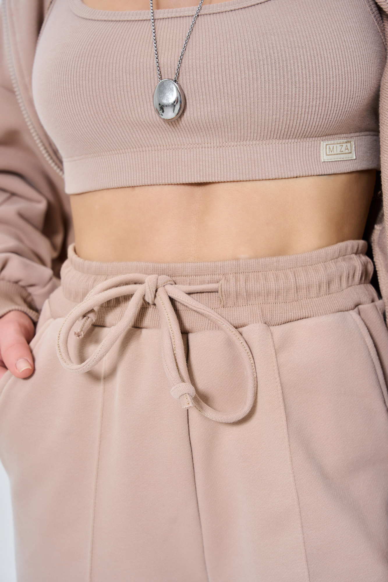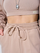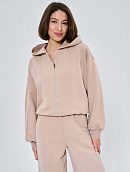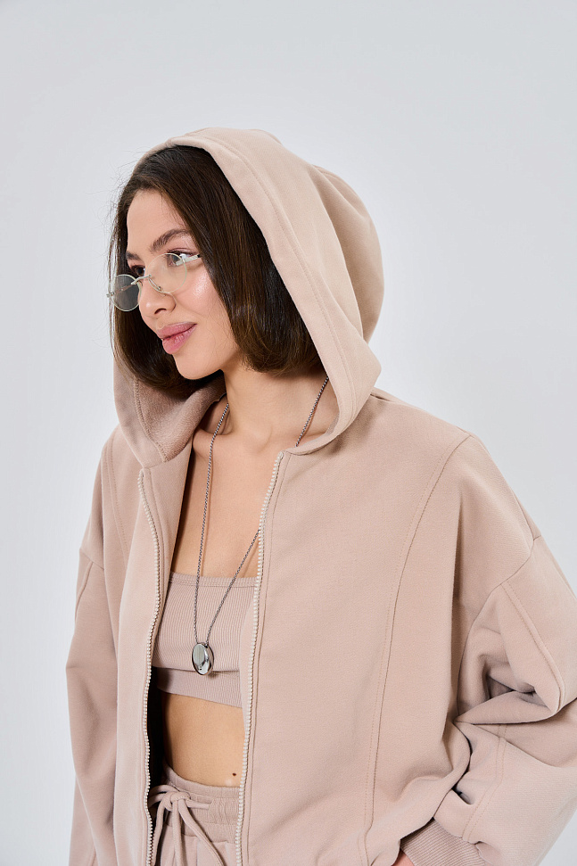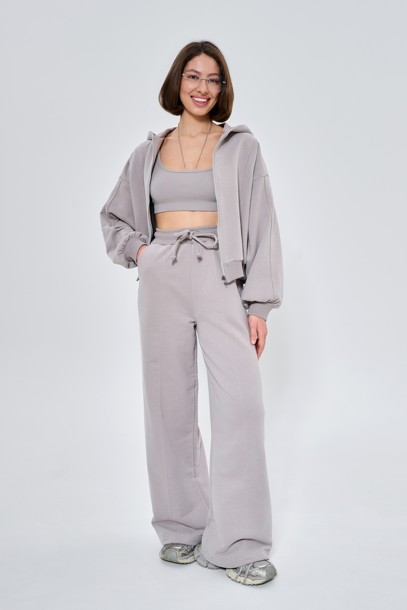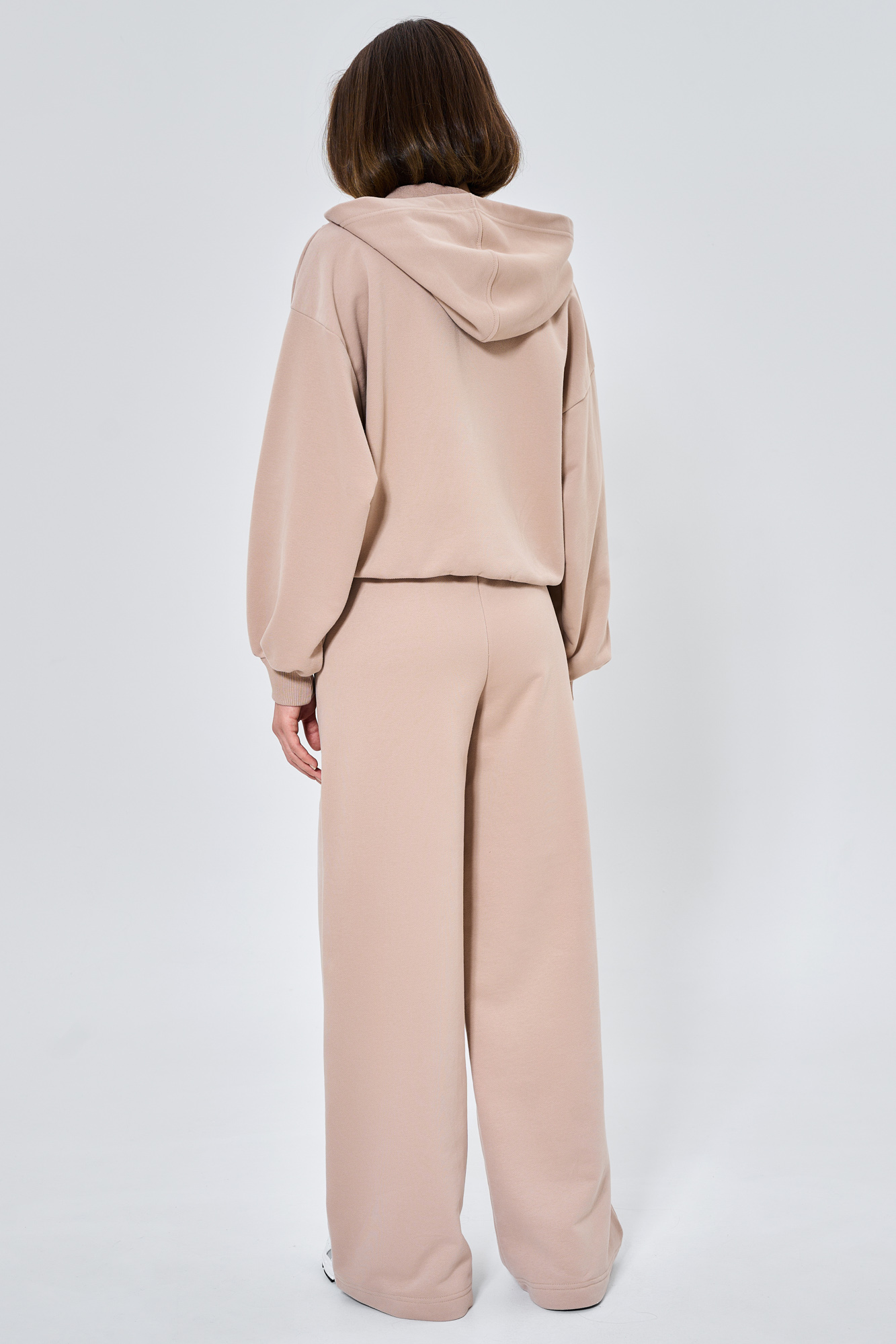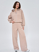 Состоит из худи объемного кроя на молнии с отделочными швами и прямых брюк палаццо с отделочным швом.