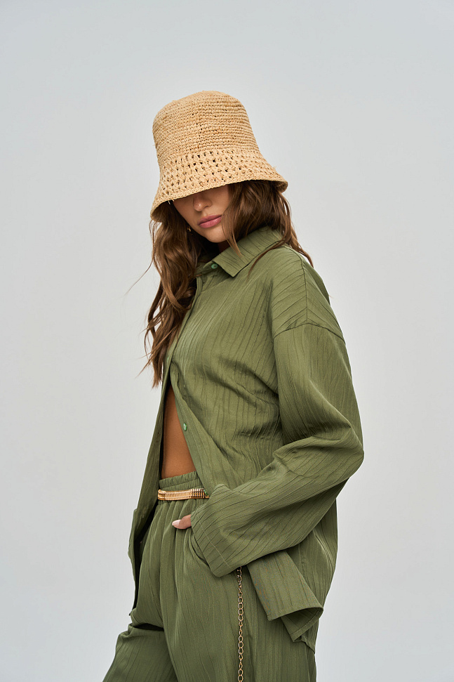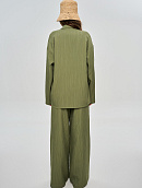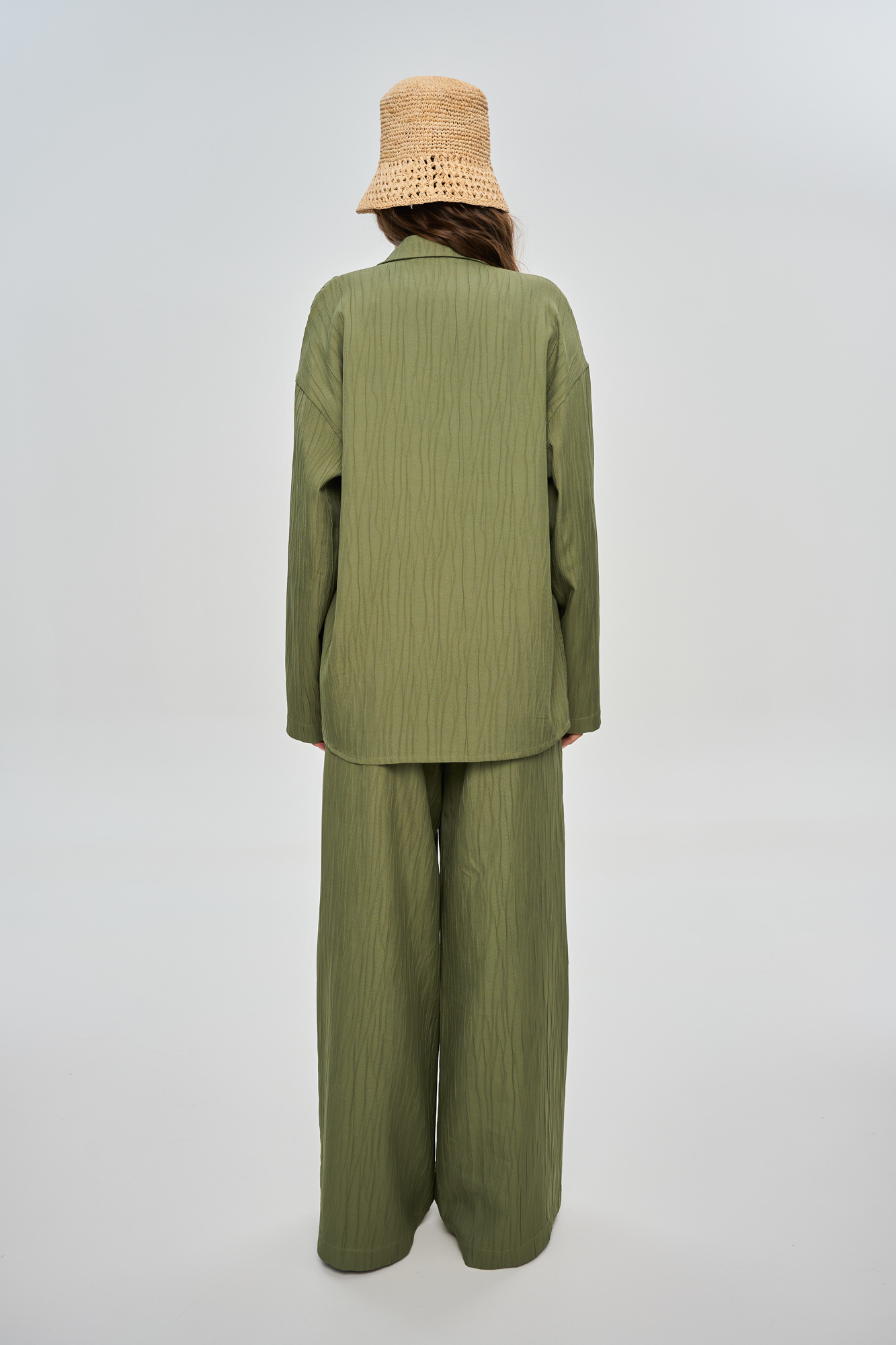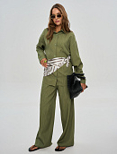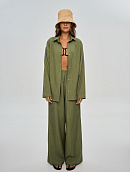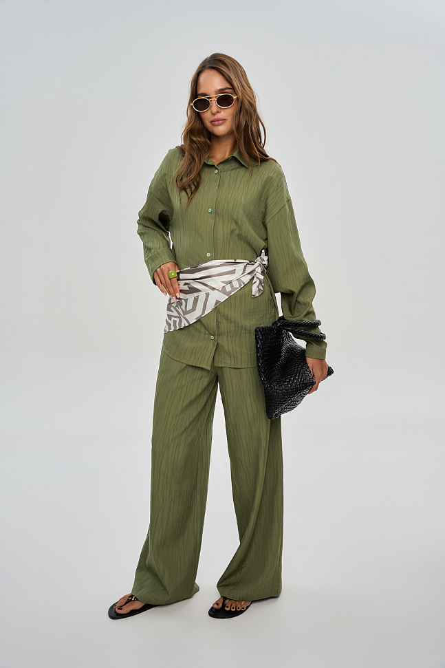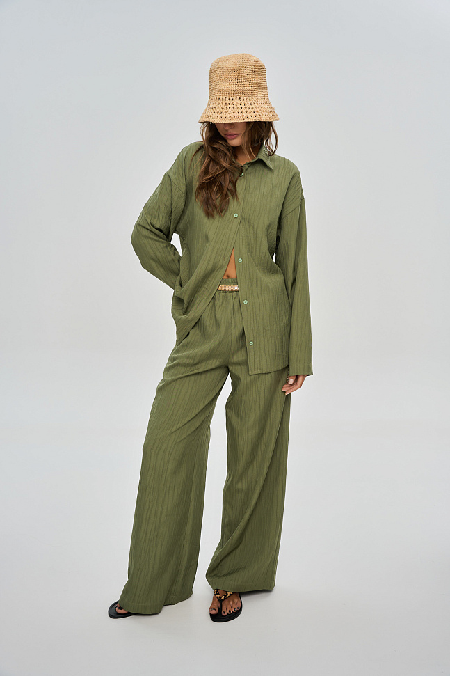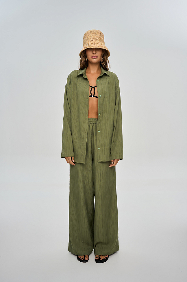 Состоит из рубашки свободного кроя с застежкой на пуговицы и прямых широких брюк кроя "палаццо".