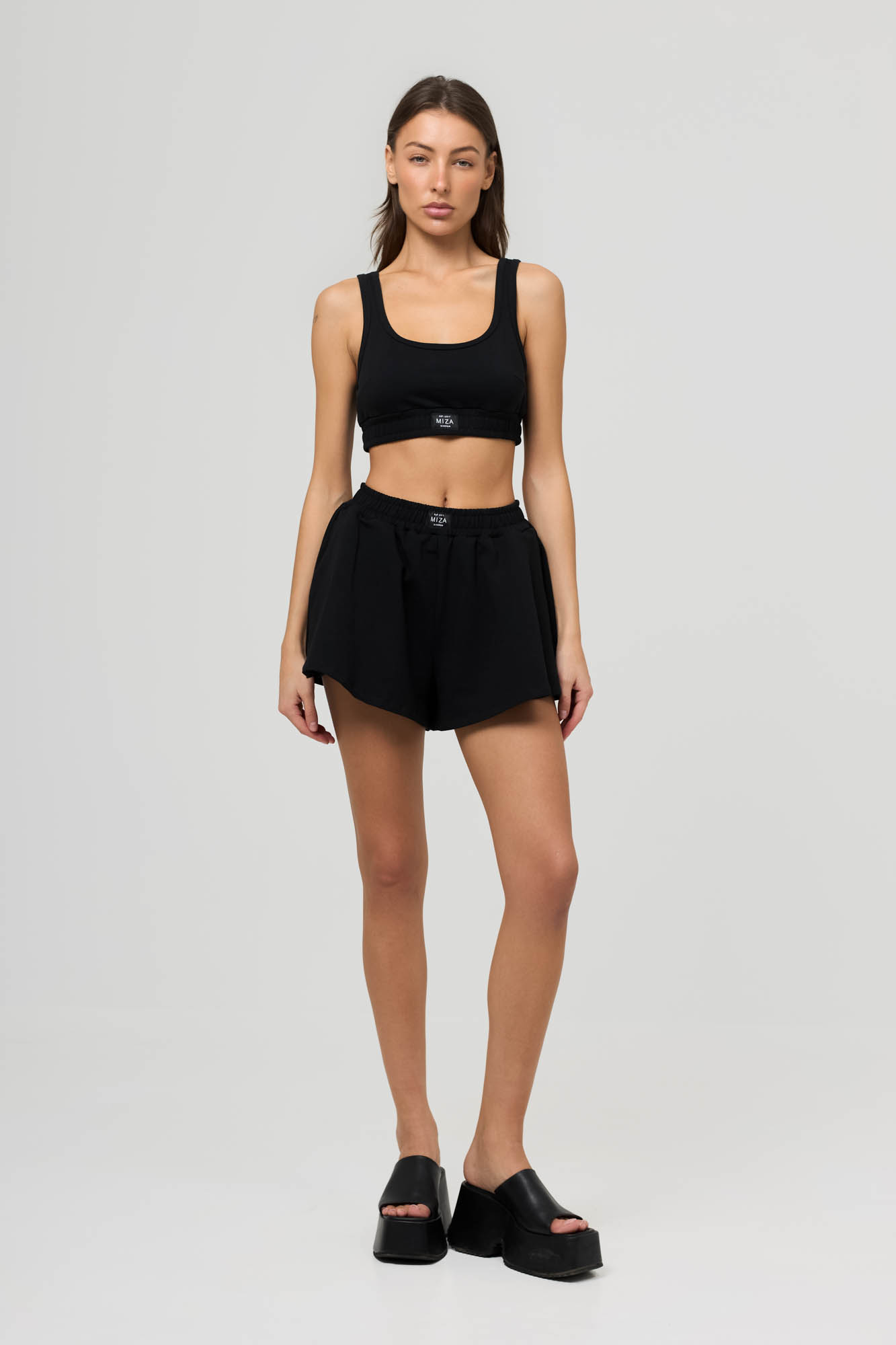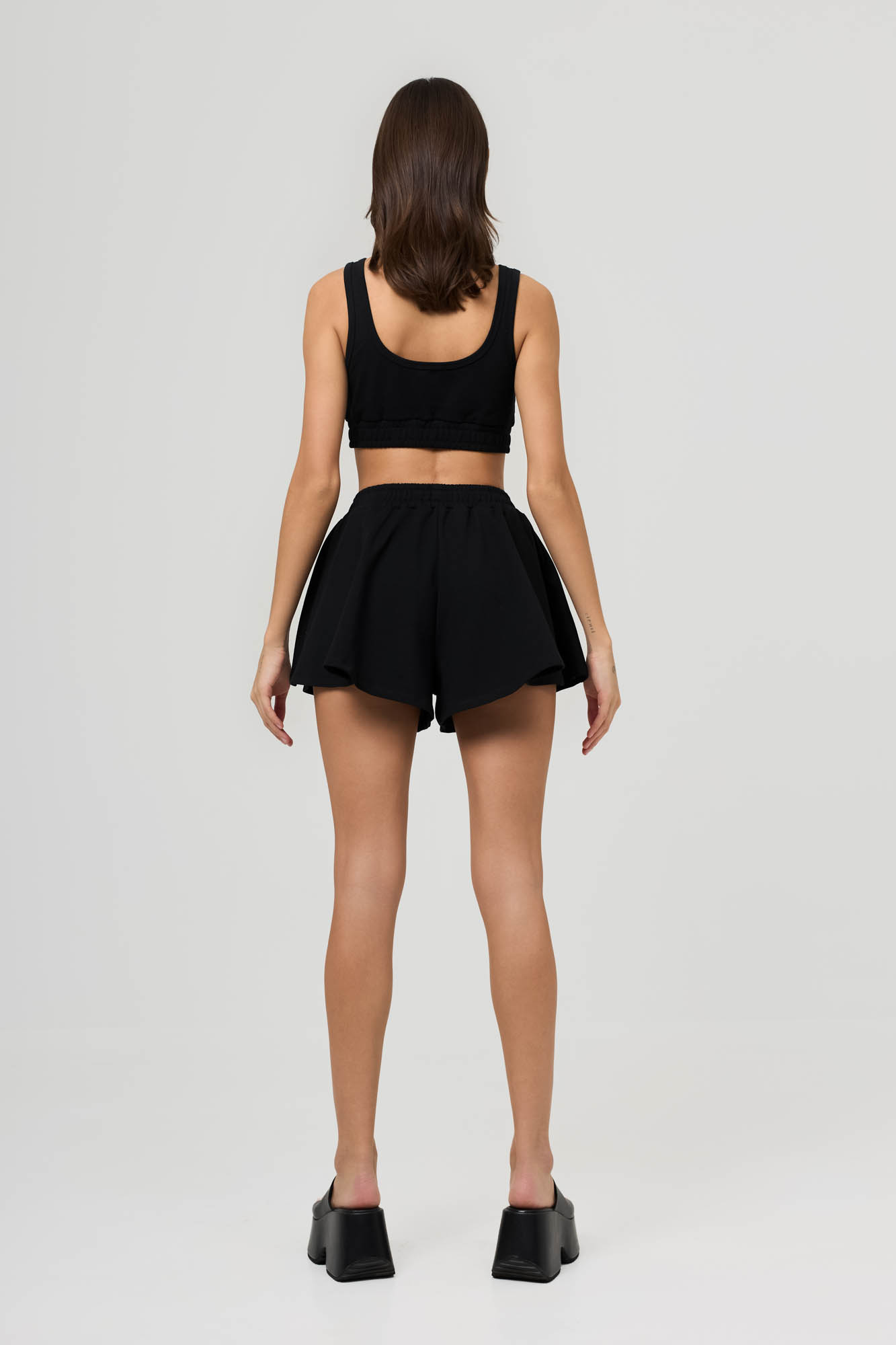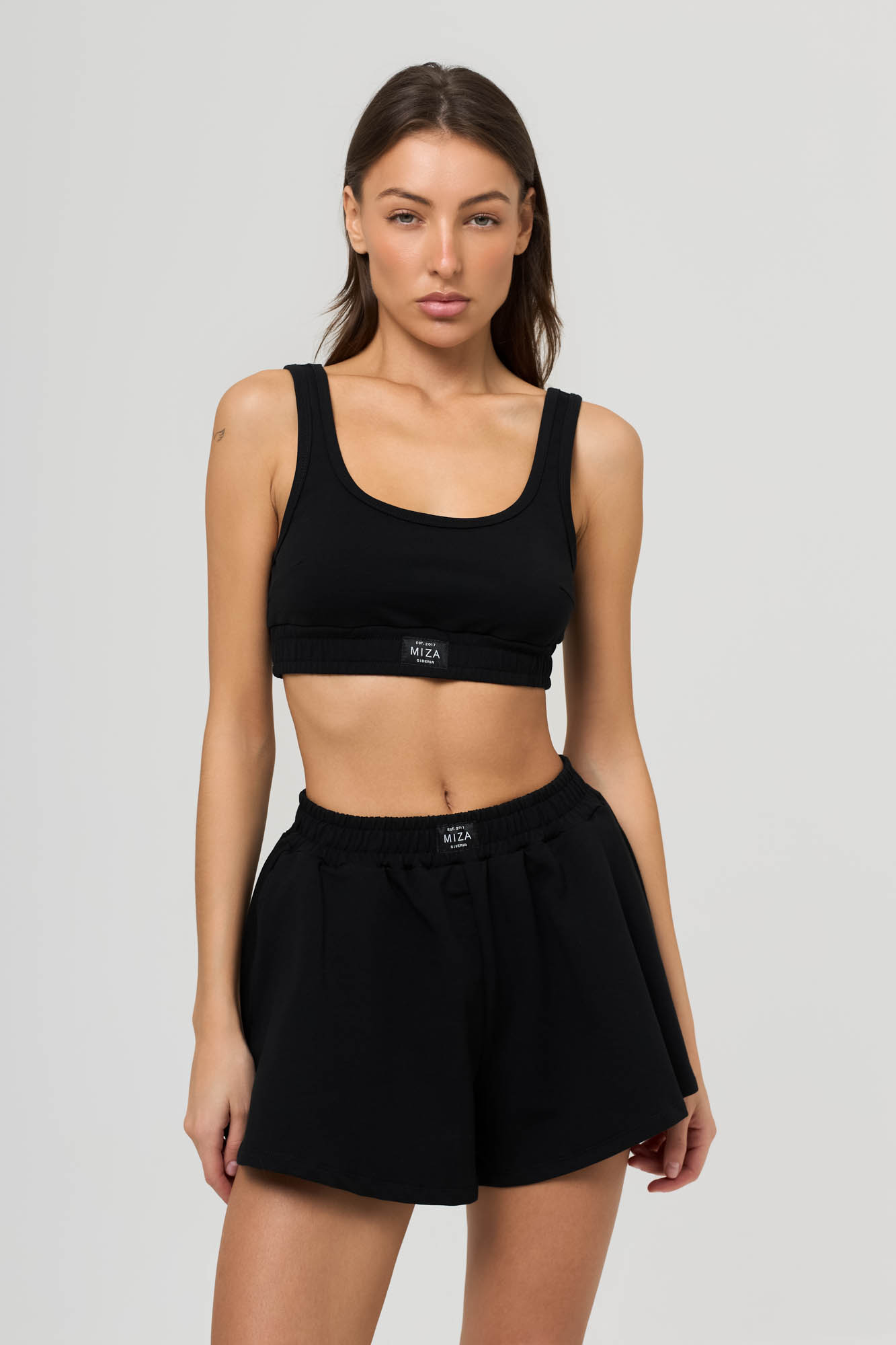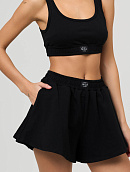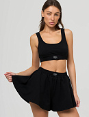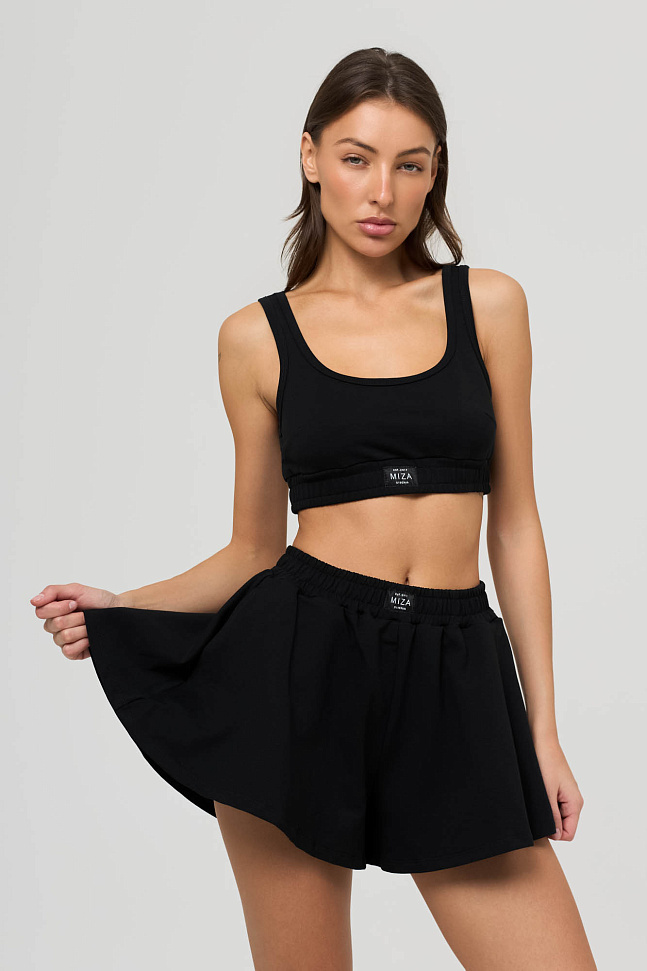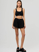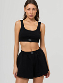 Состоит из бралетта на широких бретелях и шортиков свободного кроя с высокой линией посадки.