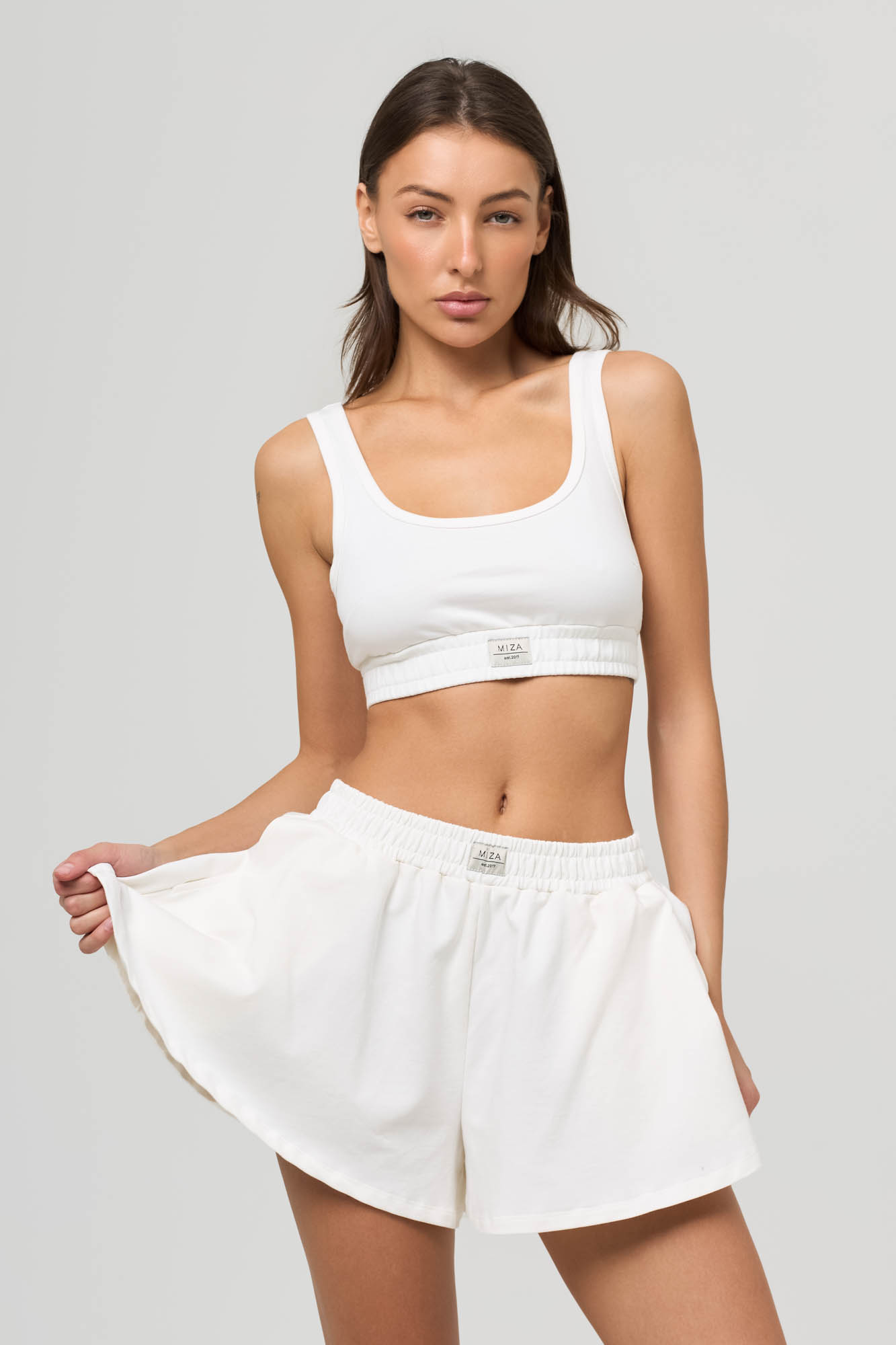 Состоит из бралетта на широких бретелях и шортиков свободного кроя с высокой линией посадки.