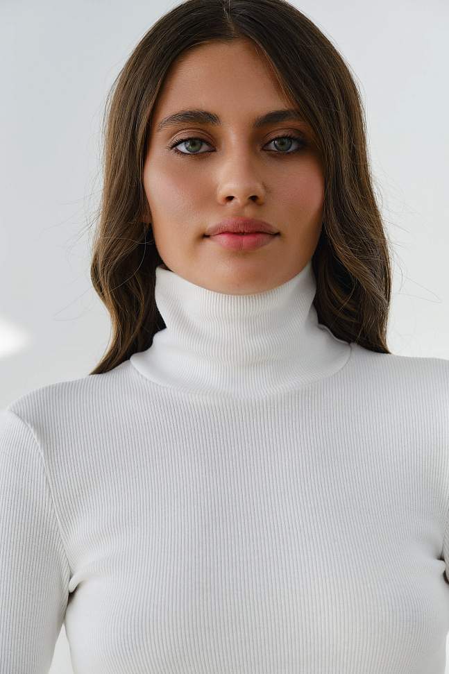 Выполнено из мягкого плотного трикотажа в узкий рубчик.