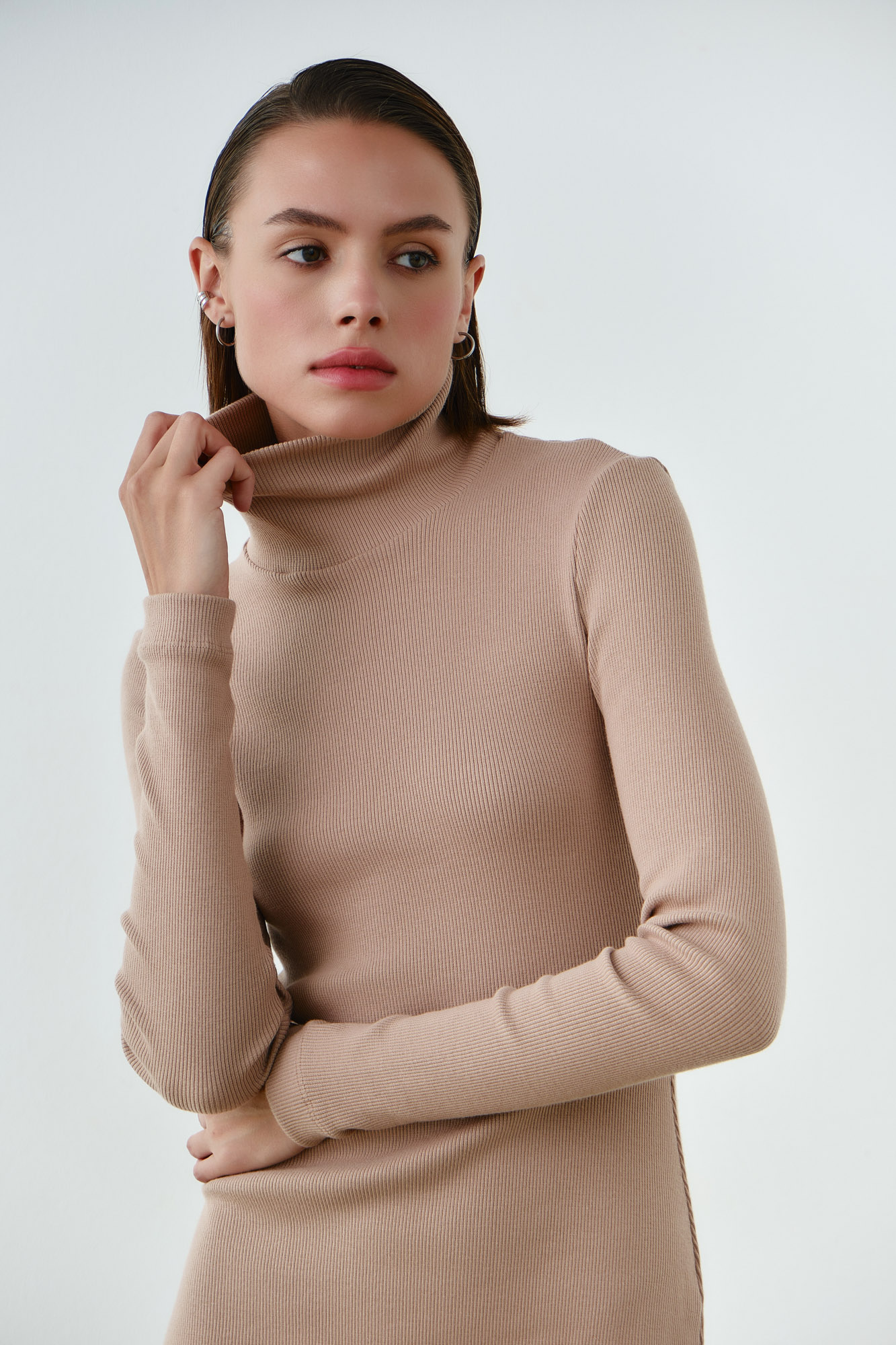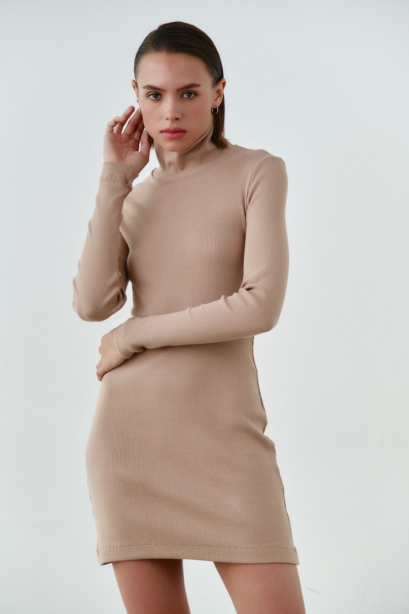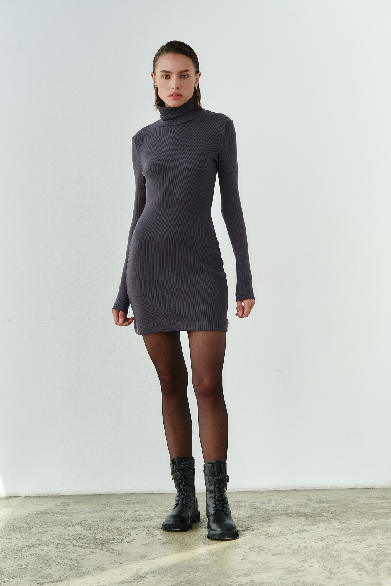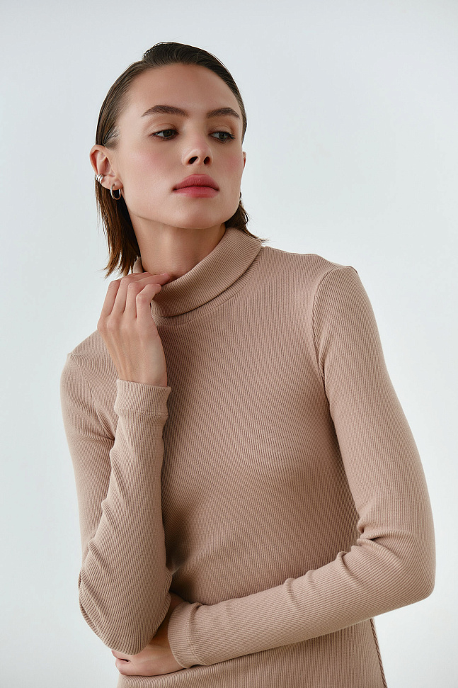 Выполнено из мягкого плотного трикотажа в узкий рубчик.