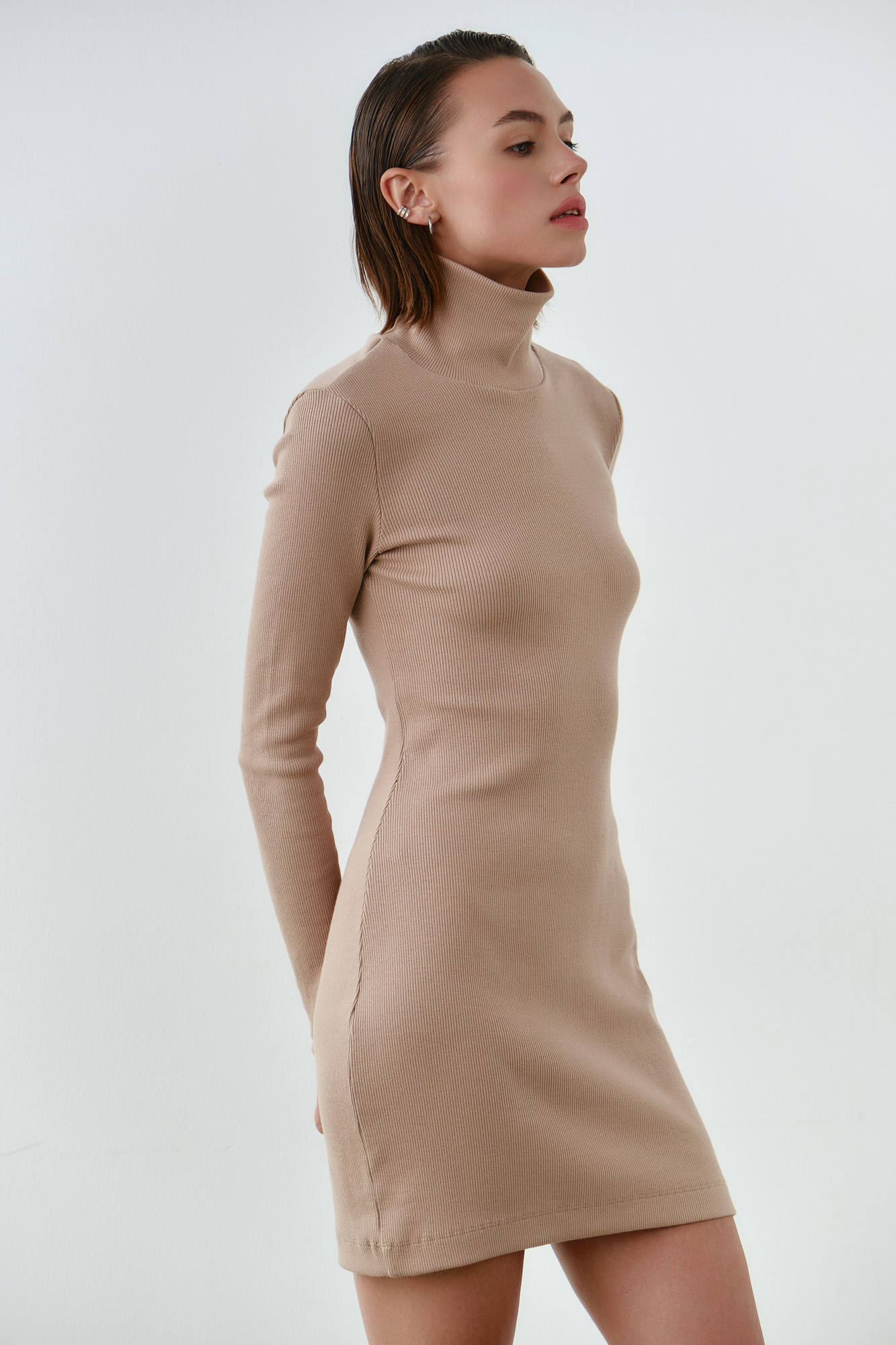 У платья высокий воротник, длинный рукав.
