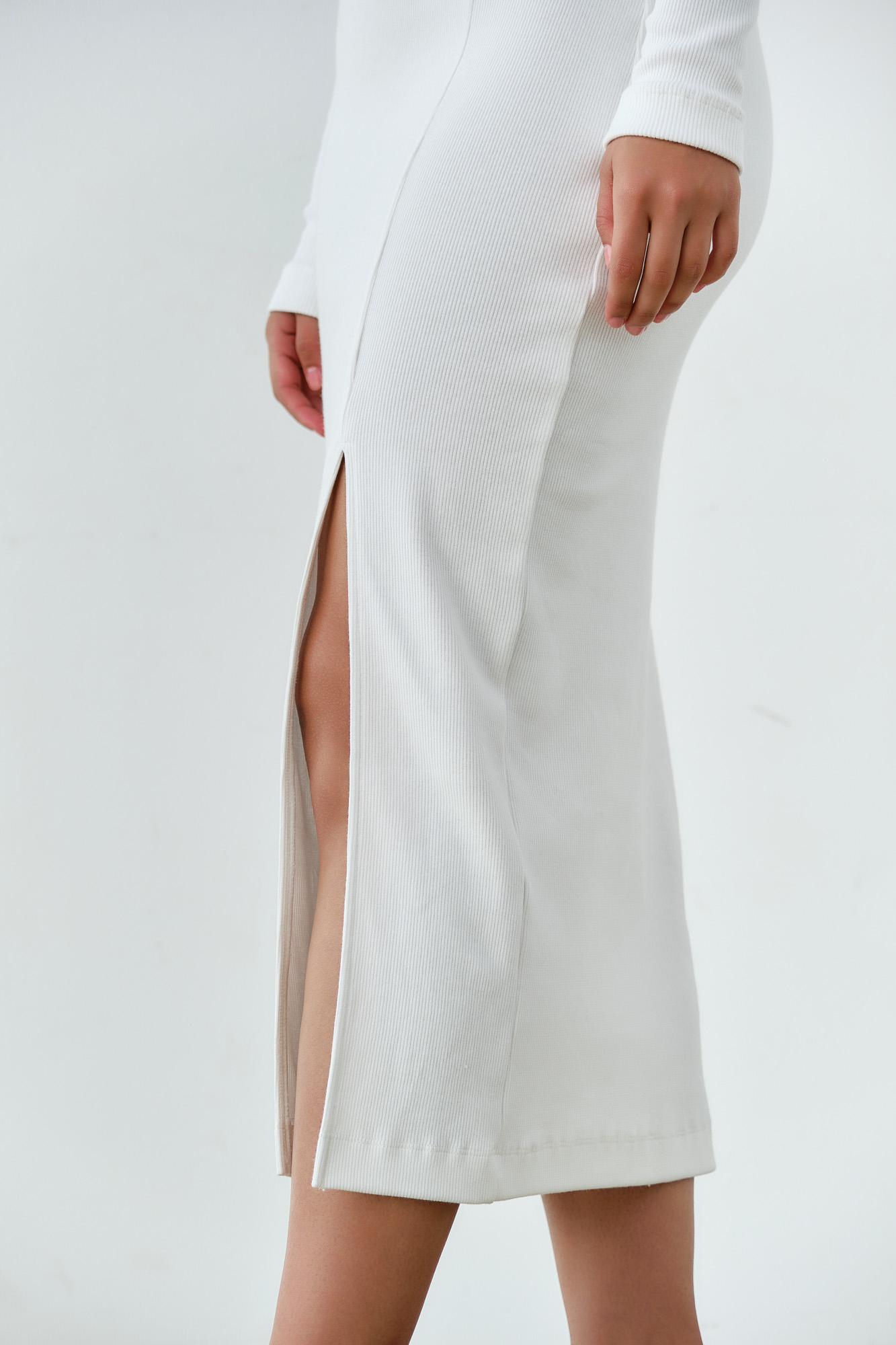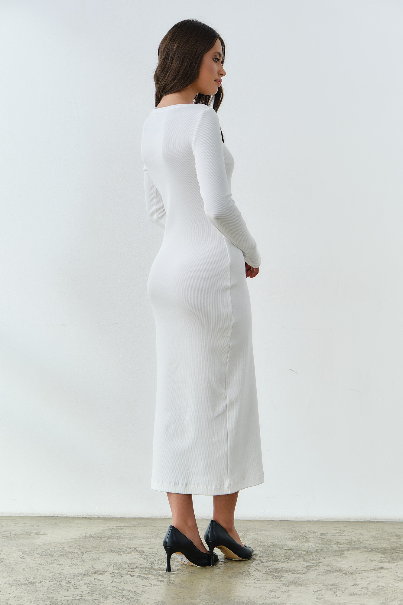 Платье прилегающего силуэта с разрезом спереди и длинным рукавом.