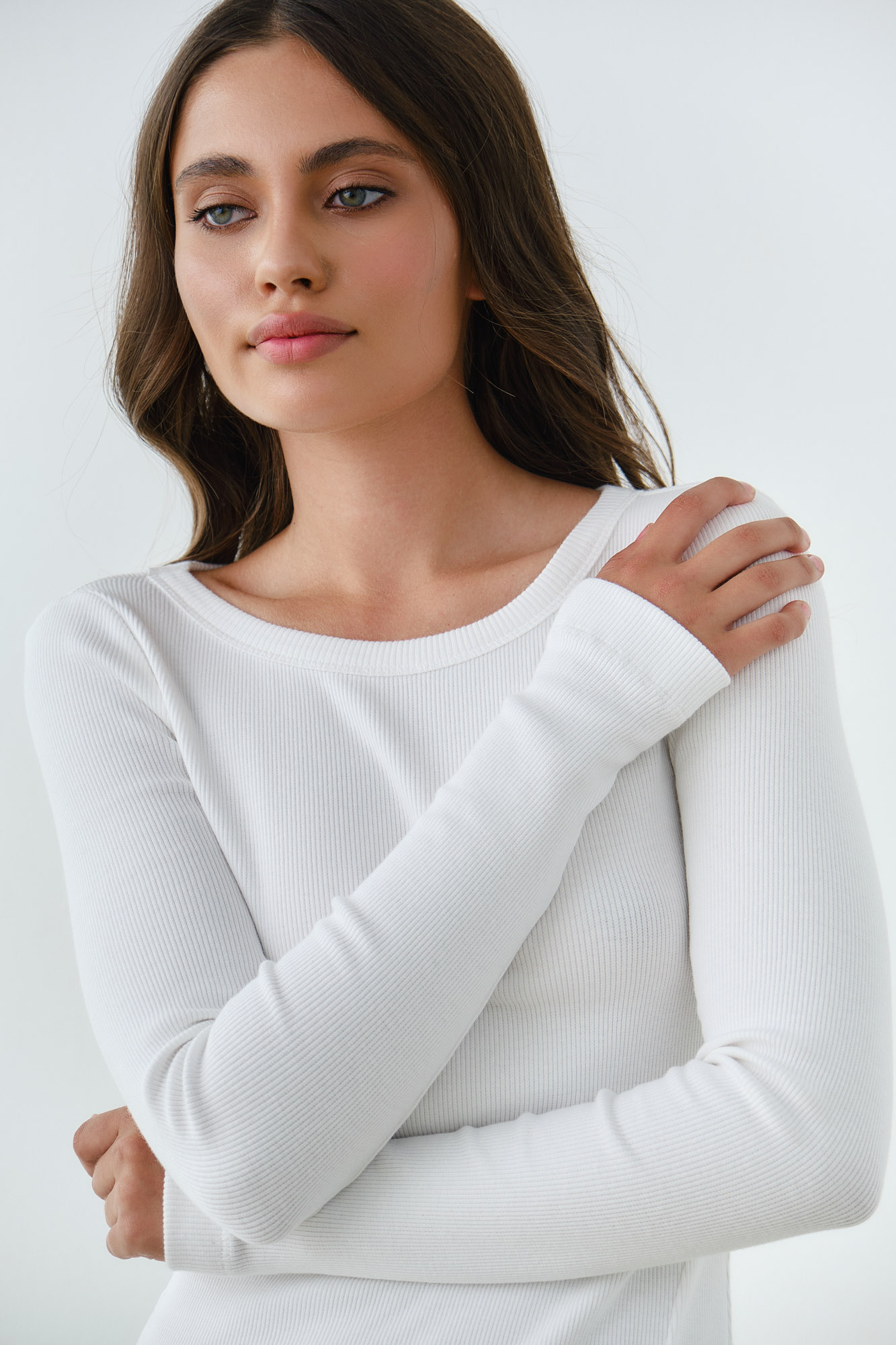 Выполнено из мягкого плотного трикотажа в узкий рубчик.